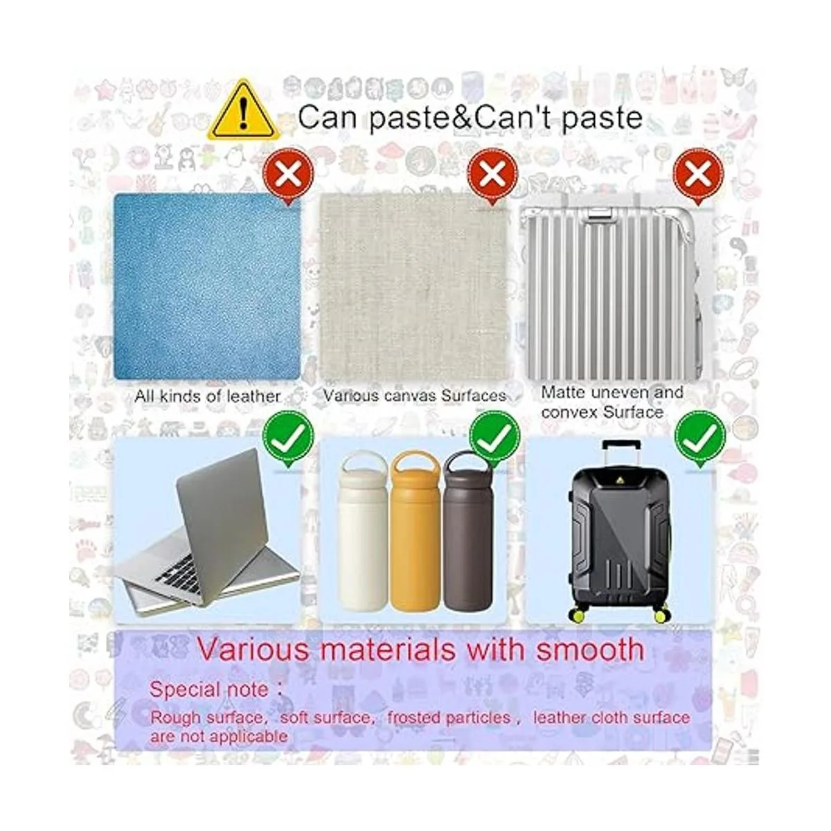 Ampliamente utilizado Decora computadoras portátiles, TV, teclados, botellas de agua, álbumes de recortes, espejos, Macbooks, cuadernos, diarios, equipaje, patinetas, esquís, bicicletas, coches y cualquier otra cosa para jugar con tu imaginación Nota: superficie rugosa, superficie suave, partículas abrasivas, superficie de tela de cuero no son aplicables. Estamos comprometidos a proporcionar a cada cliente los mejores productos y servicios, así como una buena experiencia de compra. Si tienes alguna pregunta, ponte en contacto con nosotros inmediatamente.