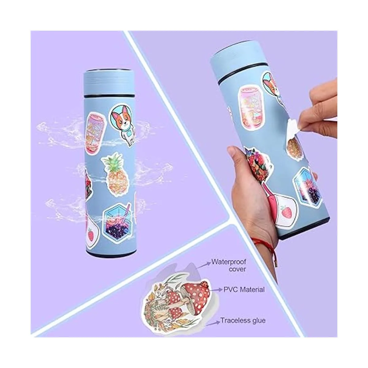 Alta calidad Las calcomanías para botellas de agua están hechas de PVC, que tiene la función de protección solar y resistente al agua, son seguras y no tóxicas y no son fáciles de romper. Elegimos un adhesivo que sea más fuerte, que es muy fuerte y no deja residuos. Nuestras bonitas calcomanías impermeables incluso se pueden lavar repetidamente en el lavavajillas.