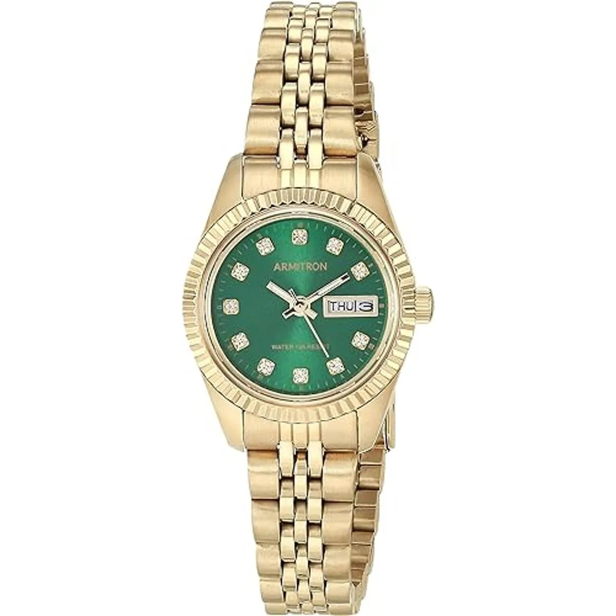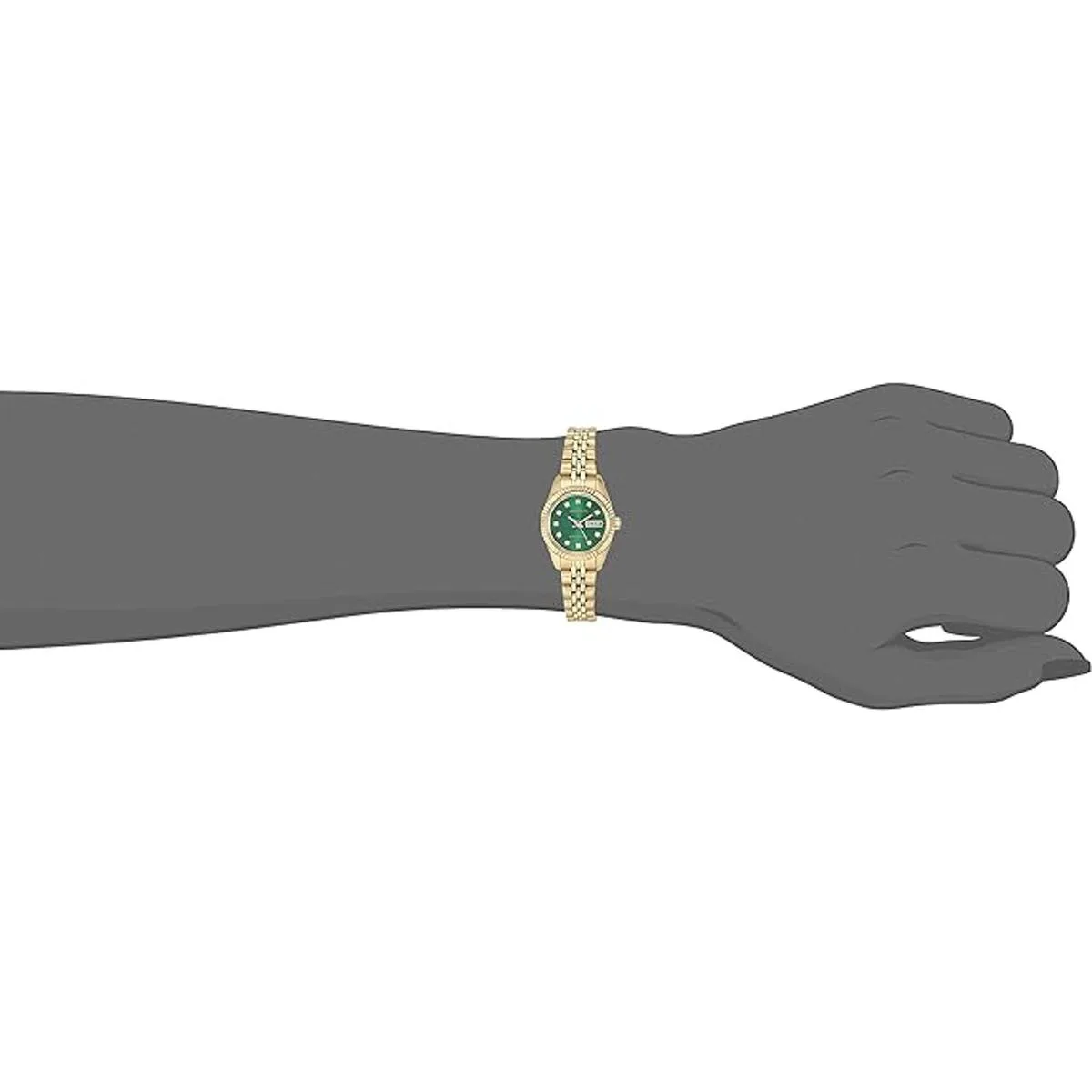 Esfera verde de rayos de sol con una ventana de calendario de día/fecha; manecillas luminosas en tono dorado y marcadores de cristal de alta calidad; pista de minutos exterior impresa