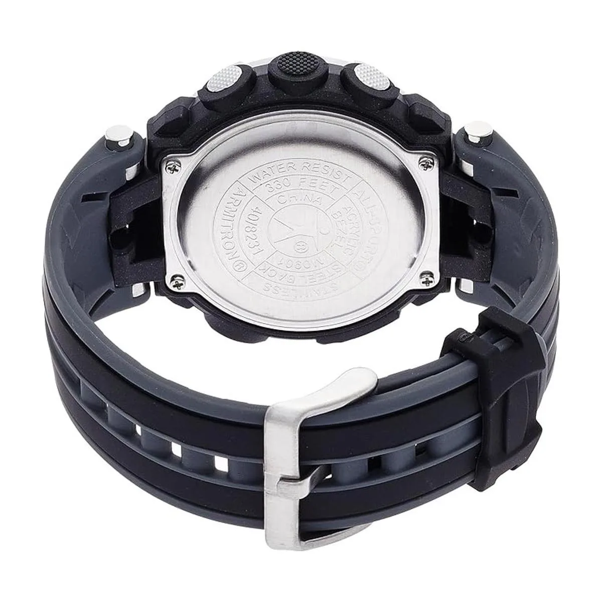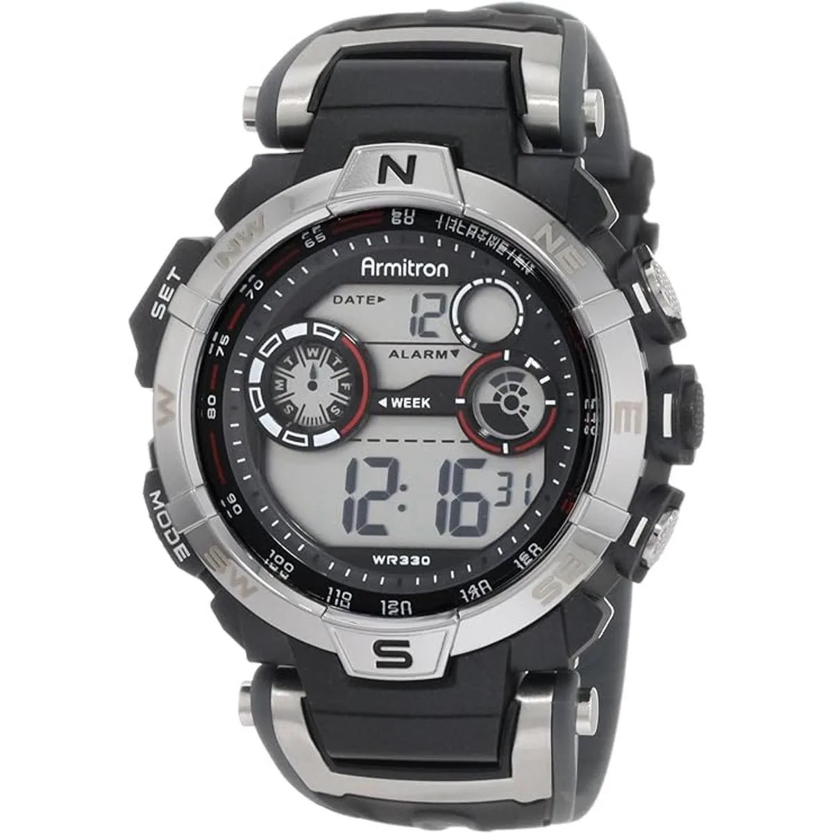 The Armitron Mens Chronograph Digital Sport Watch offers a technologically savvy watch appealing to all those with an adventurous side. The round, black, resin case and bezel feature a polished metalized chrome top ring, silvertoned accents, and engraved compass markings on the top ring. The grey digital dial displays the time across the bottom center in Arabic numerals with the seconds displayed just to the right of the time. The date is easy to read at the top center of the dial and the day of the week is clearly displayed in a circular window at the top left of the dial. Other functions of this watch include chronograph functions, alarm, lap timer, countdown timer, hourly chime, and military time. The comfortable grey resin strap securely fastens with a buckle clasp. This timepiece offers reliable Japanese quartz movement and is protected by a durable mineral crystal. The watch is waterresistant to a depth of 330 feet 100 meters.