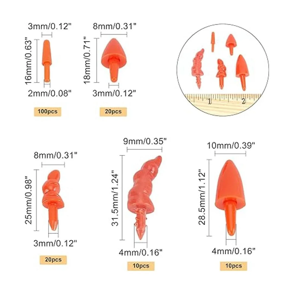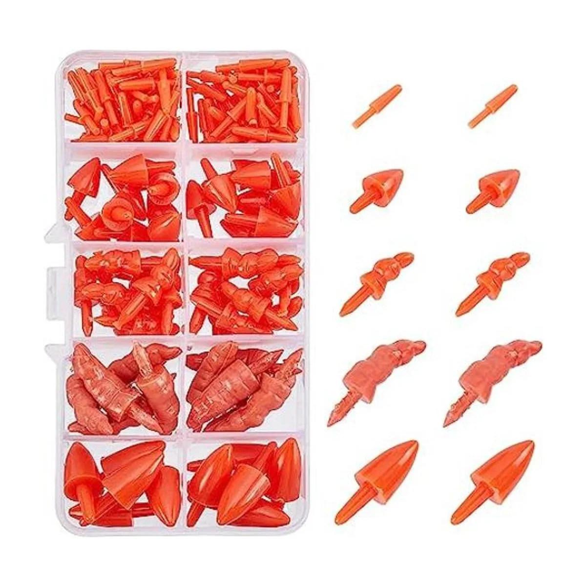 El paquete incluye: recibirás alrededor de 160 piezas de accesorios de nariz de plástico rojo naranja y un recipiente de plástico, incluye 5 tamaños. Para obtener información sobre las tallas, consulta el dibujo de detalles.