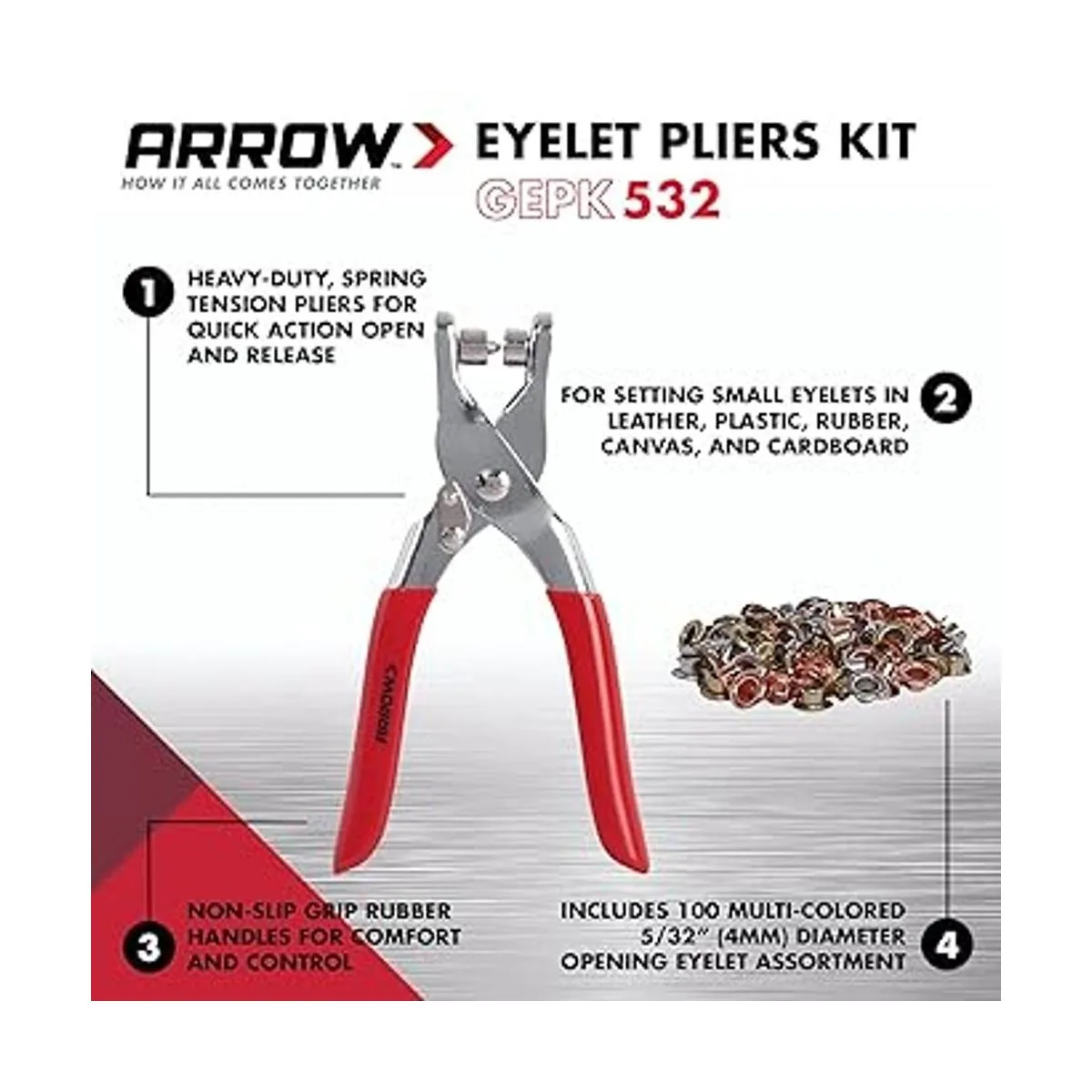 Arrow GEPK532 Juego de herramientas con ojales, alicates perforadores para tela, cuero, lona, incluye 100 ojales, 532 pulgadas