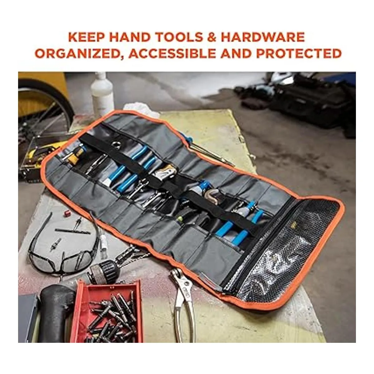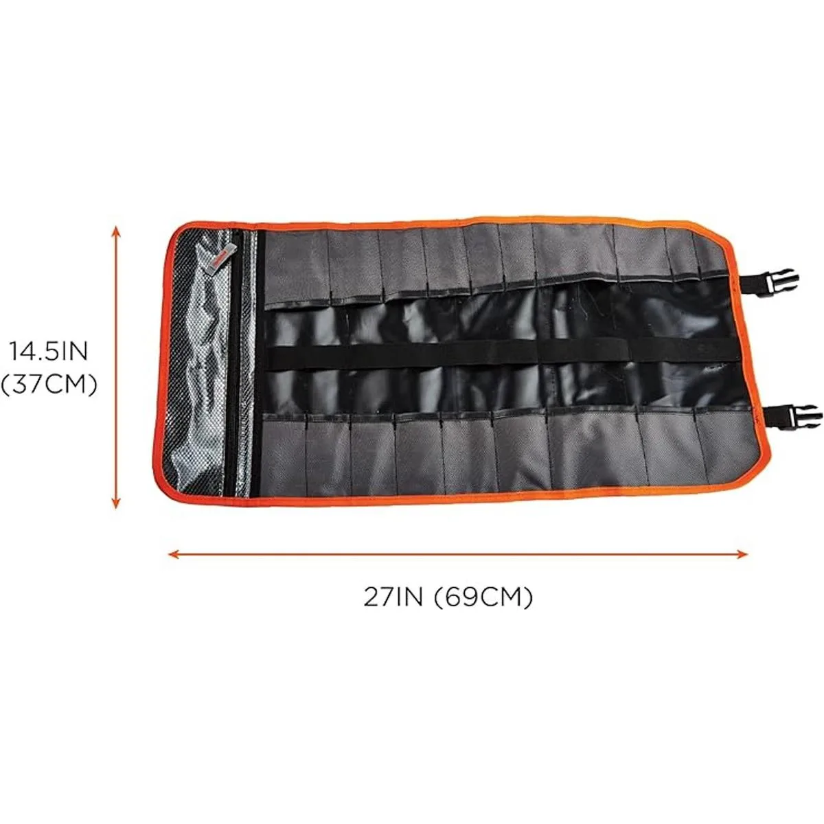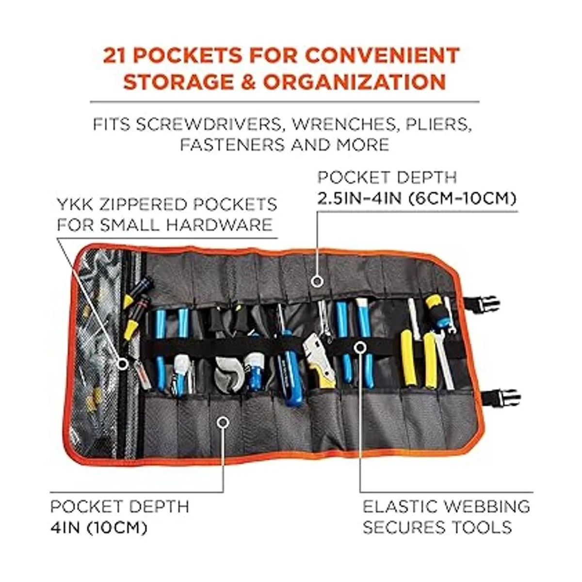 MAXIMUM STORAGE 21 pockets with elastic webbing in the middle to store, organize and protect various sized tools. Two waterproof tarpaulin zipper pockets with YKK zippers to secure sockets, small tools or hardware
