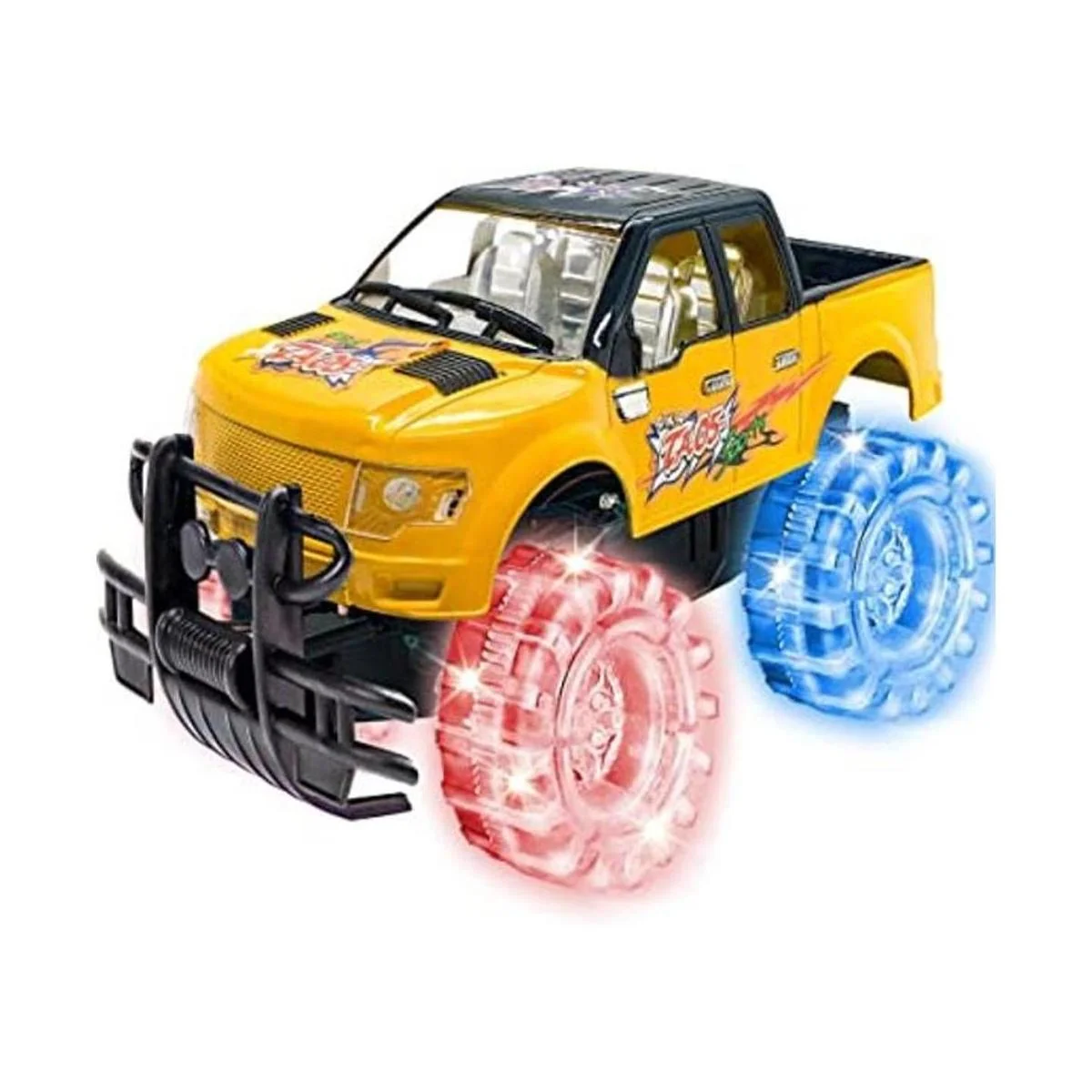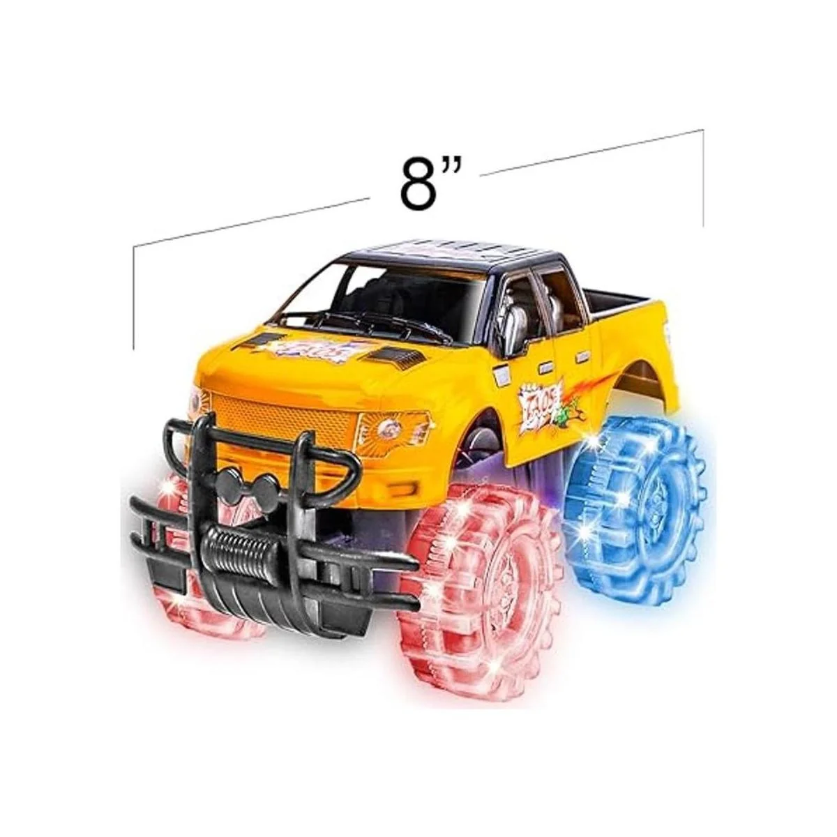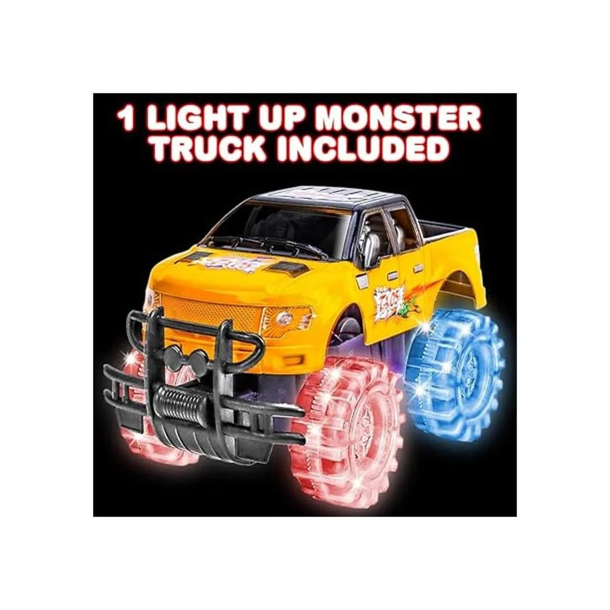 ArtCreativity Camión monstruo amarillo y negro iluminado, 1 unidad, camión monstruo de 8 pulgadas con neumáticos LED intermitentes y baterías, juguetes de coche Push n Go para niños, regalo divertido para niños y niñas a partir de 3 años