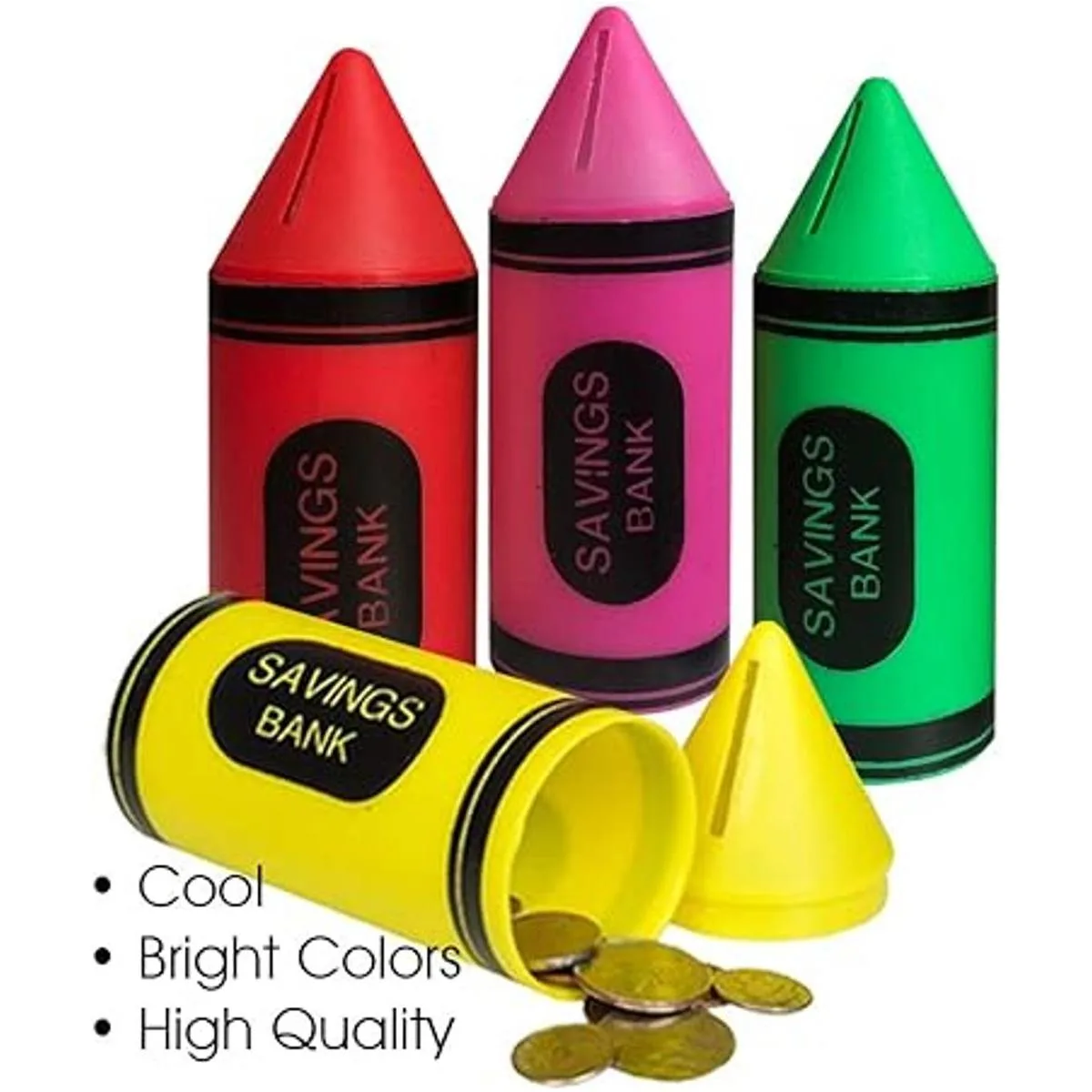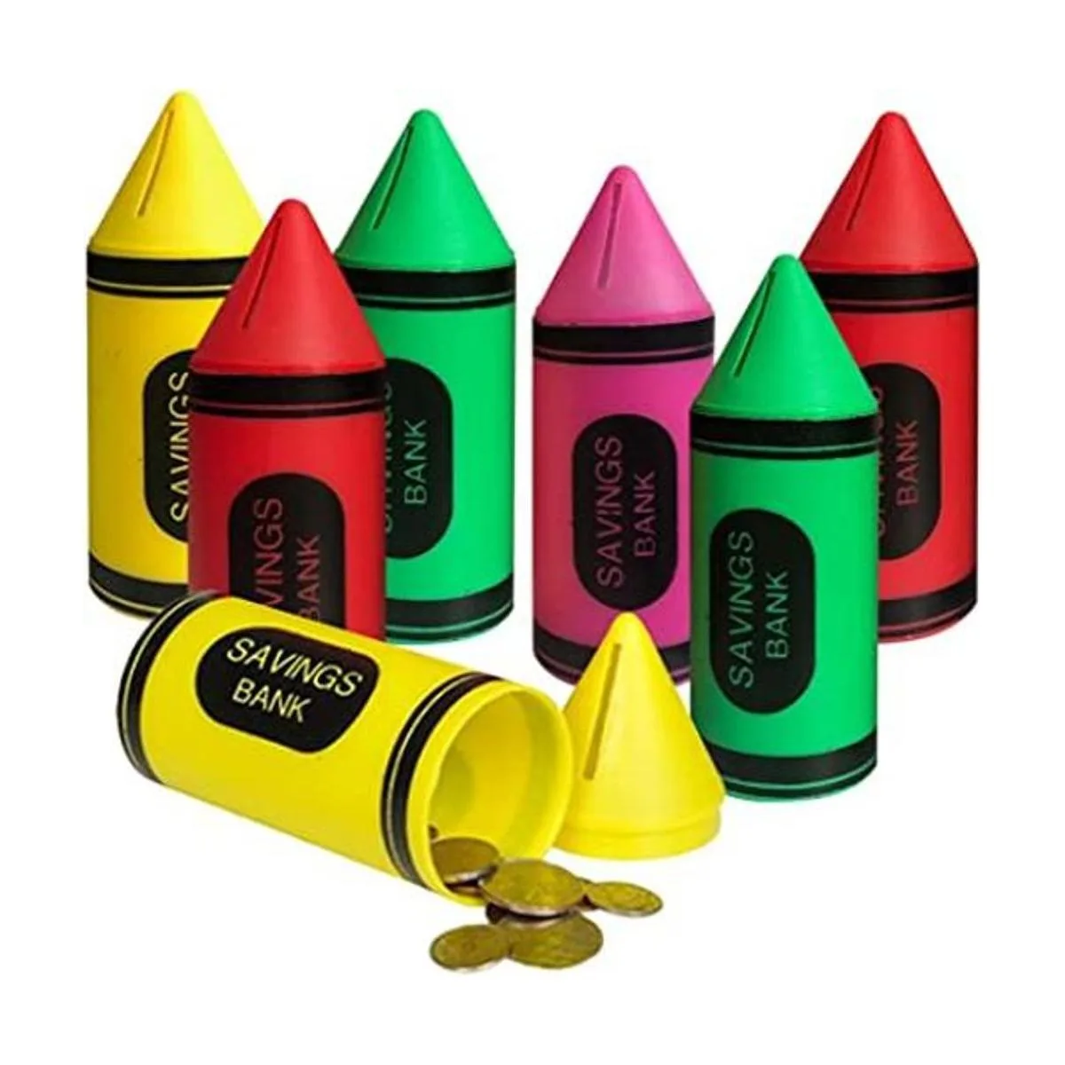 Ahorra con una sonrisa: bancos de monedas para niños inspirados en sus suministros de arte favoritos Este paquete viene con 12 alcancías de crayón 6 pulgadas que hacen que ahorrar sea un asunto divertido. Ideal para ahorrar cambios sueltos, estos bancos de monedas de crayón enseñan a los niños hábitos de dinero sabios desde una edad temprana.