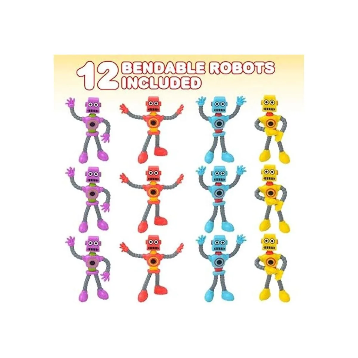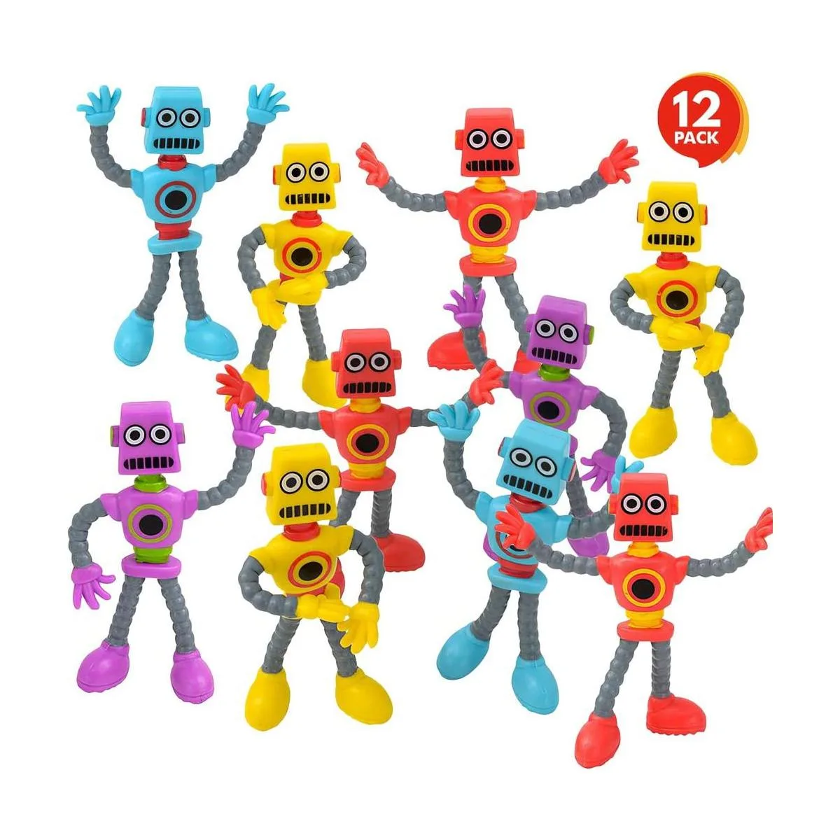 Surtido vibrante: añade un poco de brillo a esa batalla. Cada juego viene con 12 robots flexibles en un llamativo surtido de colores brillantes. Los personajes felices incluyen rojo, amarillo, azul y morado, 3 de cada color. El surtido puede variar.