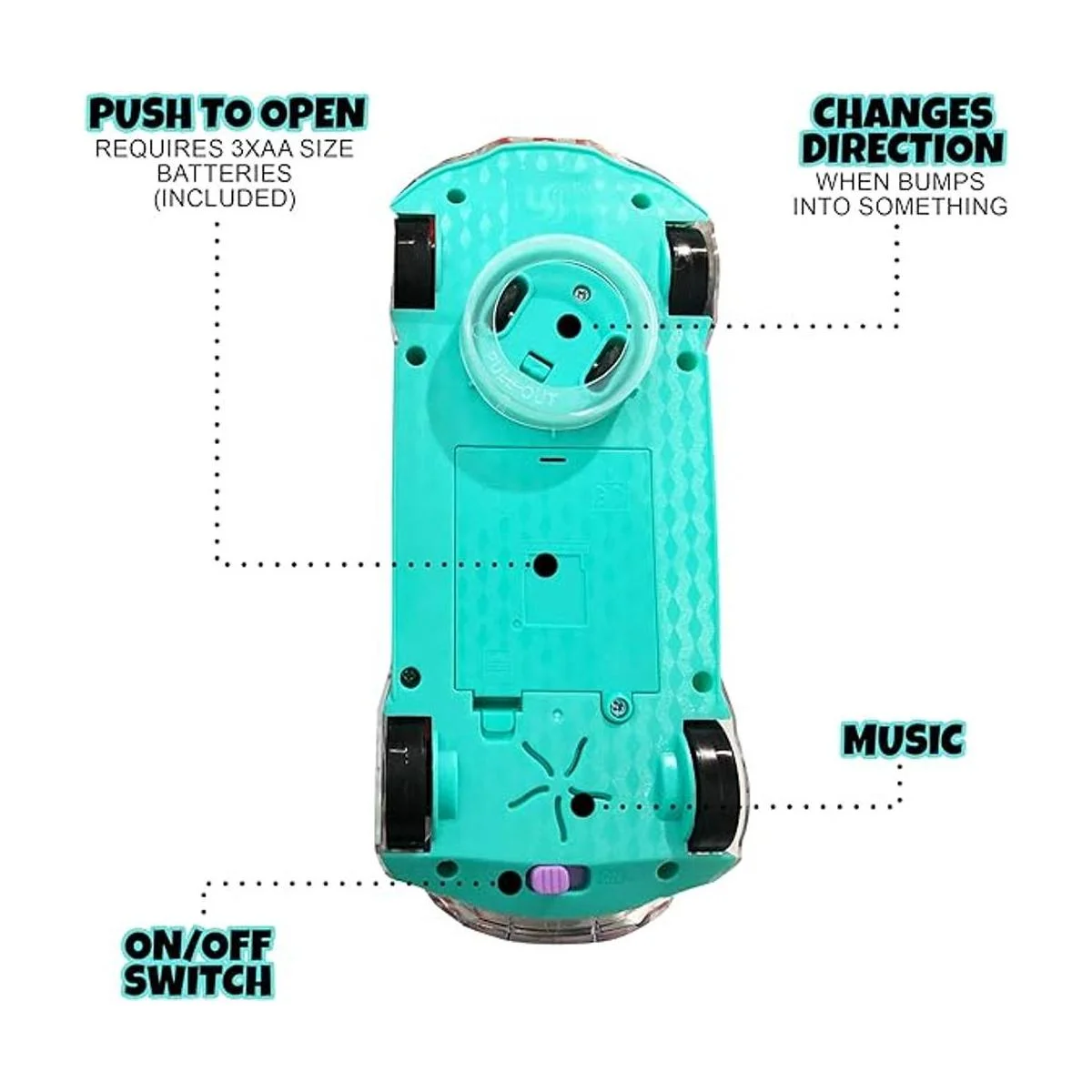 Mecanismo Bump N Go Los pequeños amantes de los coches de carreras se transfieren con emoción mientras observan la frescura. Cada vez que este juguete de coche iluminado golpea una barrera, cambia automáticamente de dirección y sigue navegando; todo gracias al motor de acción Cool Bump and Go.