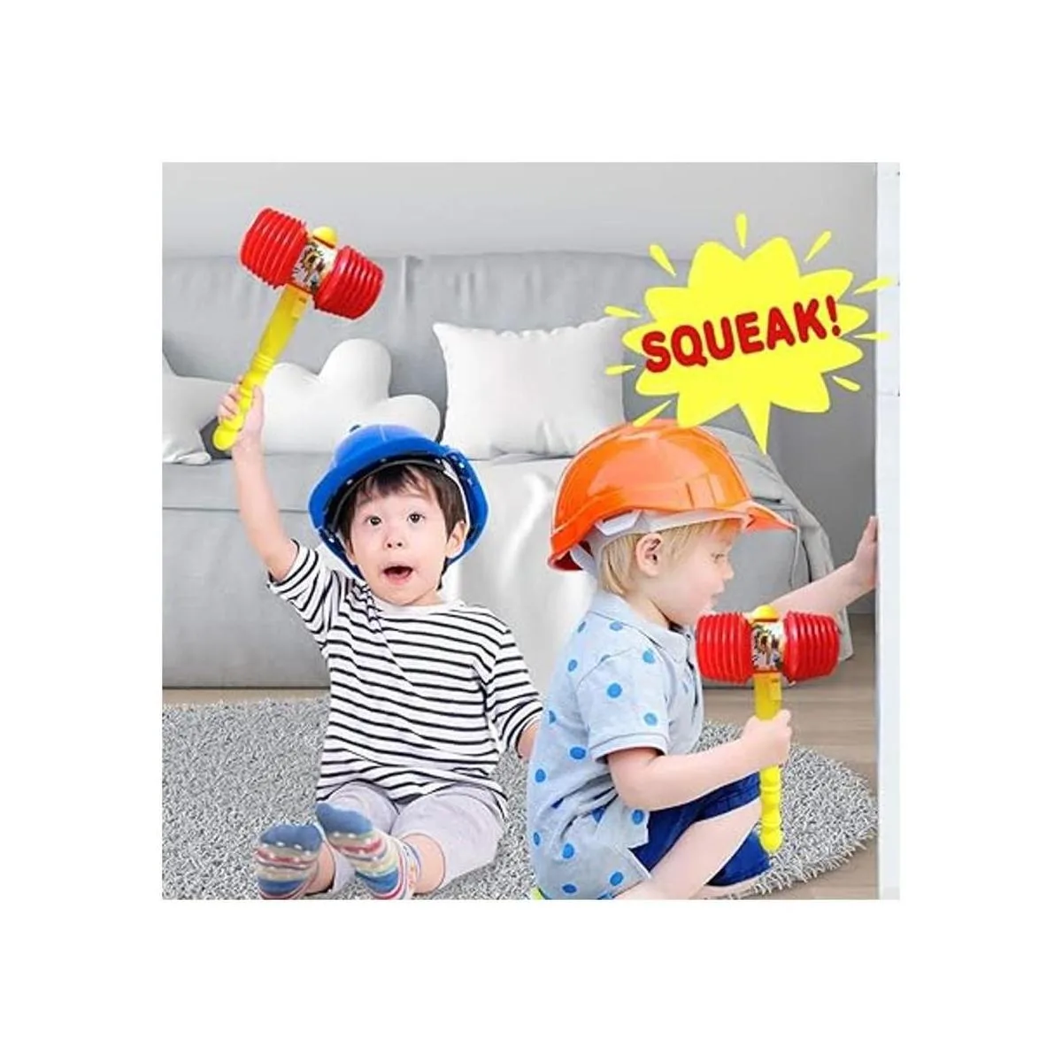 Seguro para jugar: fabricado con plástico suave pero duradero, este juguete gigante de martillo chirriante resiste toda la acción de golpeo mientras mantiene tu lindo agradable y seguro. El mango es de tamaño para manos pequeñas y texturizado para un agarre seguro. Esto significa un agarre firme incluso para niños pequeños.