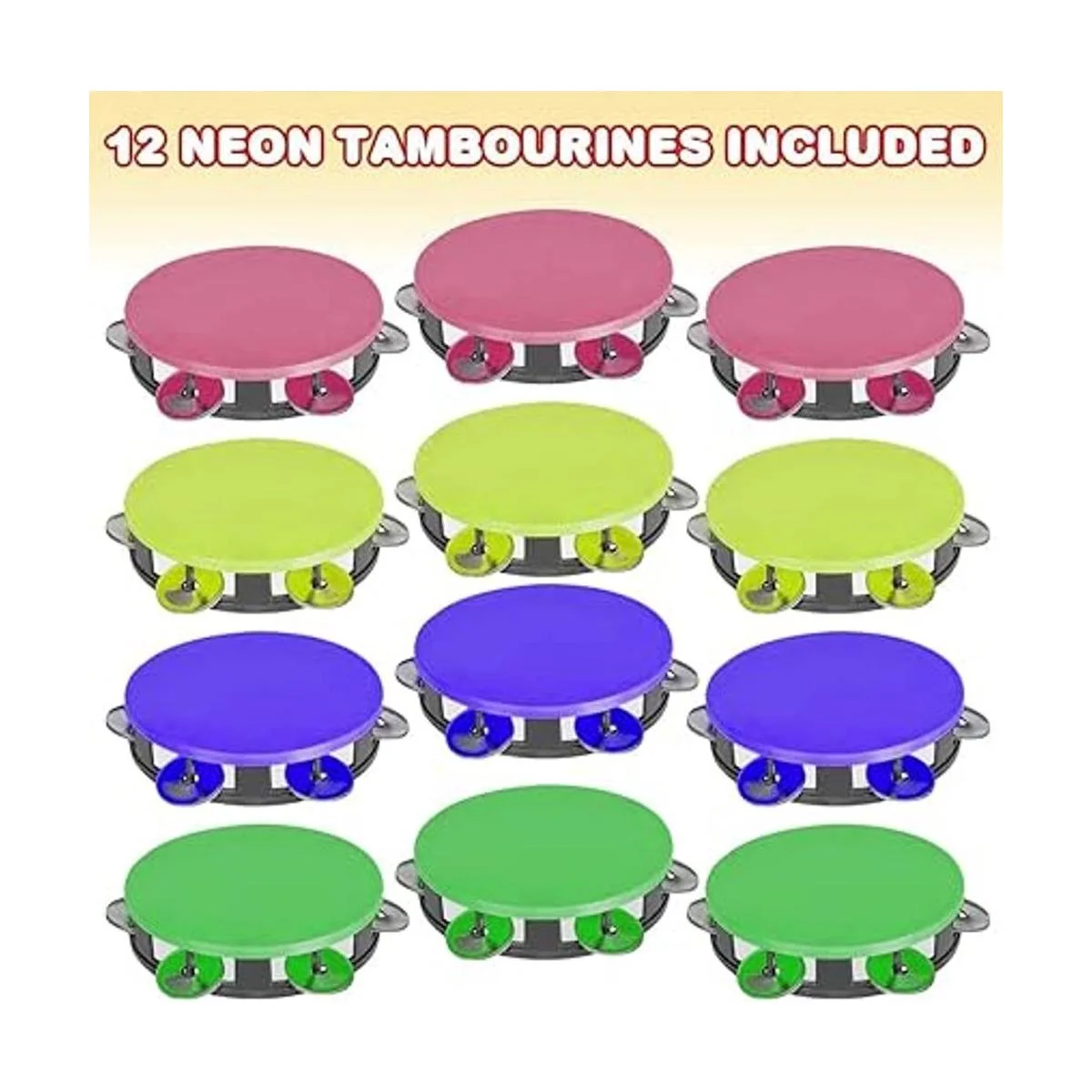 ArtCreativity Panderetas de neón para niños, juego de 12 instrumentos musicales de percusión para niños y niñas, plástico duradero y metal para hacer ruido, regalos de fiesta de cumpleaños y bolsas de alimentos, 4 colores