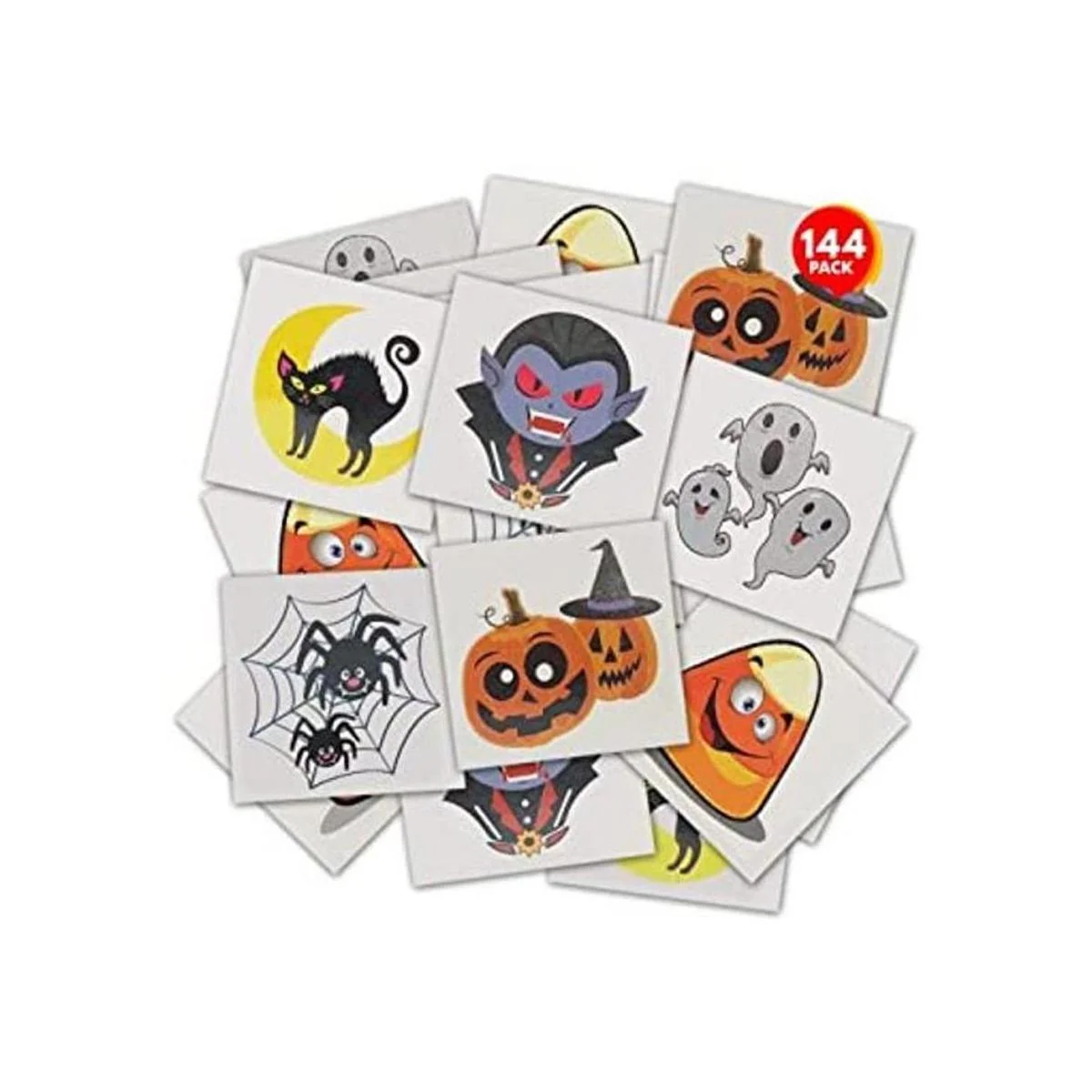 ArtCreativity Tatuajes temporales de Halloween para niños, paquete de 144 calcomanías de tatuajes no tóxicos de 2 pulgadas para niños y niñas, lo mejor para recuerdos de fiesta de Halloween, golosinas, decoración y bolsas de golosinas, 6 diseños surtidos, los diseños pueden variar