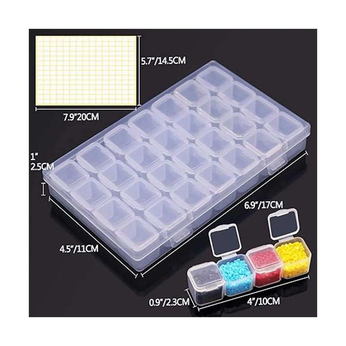 Portabilidad: caja exterior de aproximadamente 6.69 x 4.33 x 2 pulgadas y rejilla pequeña aprox.: 0.94 x 0.98 x 0.9 pulgadas, puedes llevar los suministros necesarios a donde estés haciendo manualidades. La funda de almacenamiento está hecha de acrílico de alta calidad, cajas transparentes, puede ver los artículos en el interior claramente y fácilmente.