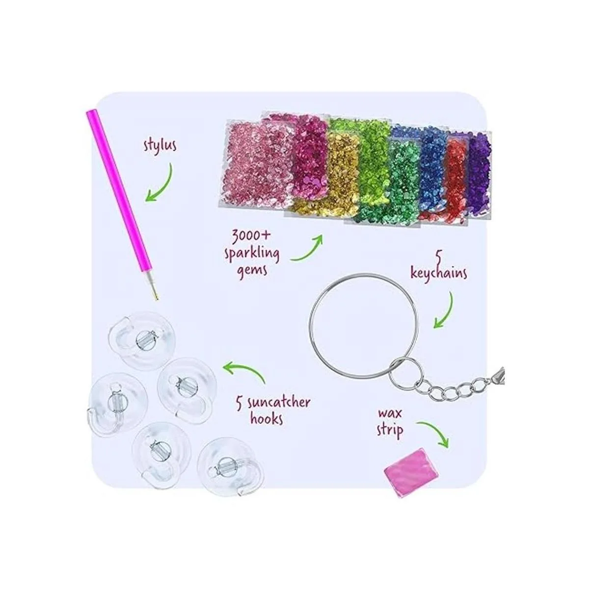 Valor premium: el kit incluye: más de 3000 gemas en 8 colores, 5 atrapasueños grandes, 5 llaveros, 6 pegatinas holográficas, tira de cera, lápiz capacitivo, 5 ventosas, instrucciones y guía de trazado.