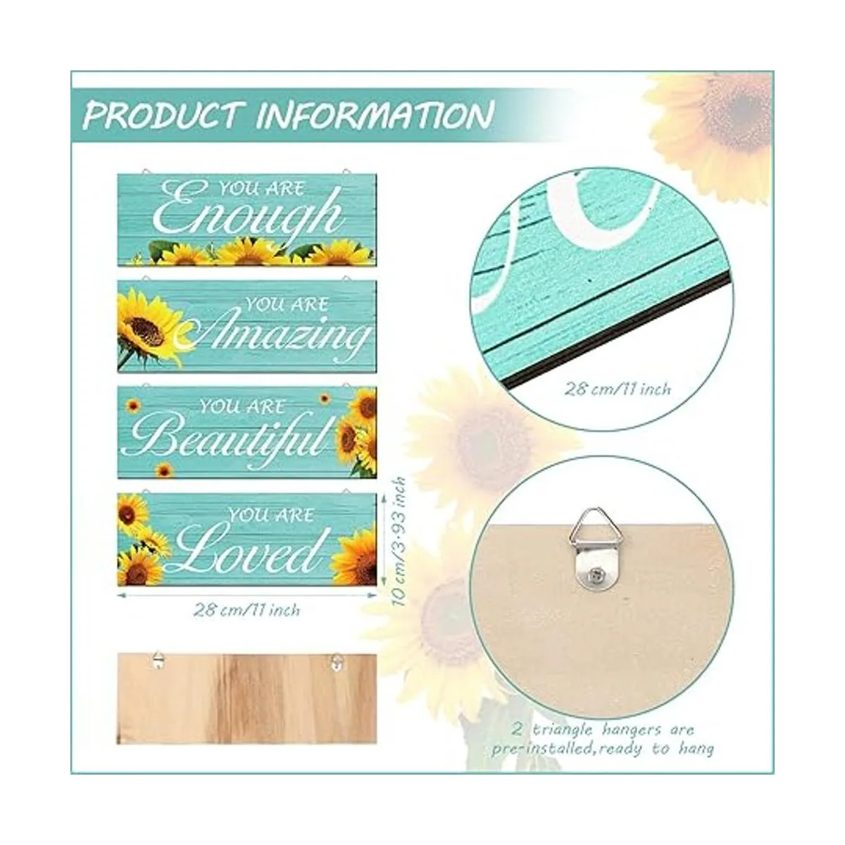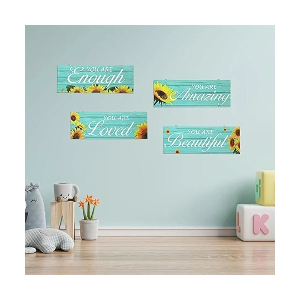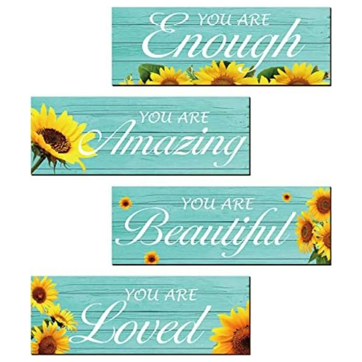 Arte de pared colgante de girasol, 4 piezas de madera vintage con texto en inglés You are Enough You are Loved, decoración de pared rústica de madera colorida para decoración del hogar, dormitorio, baño