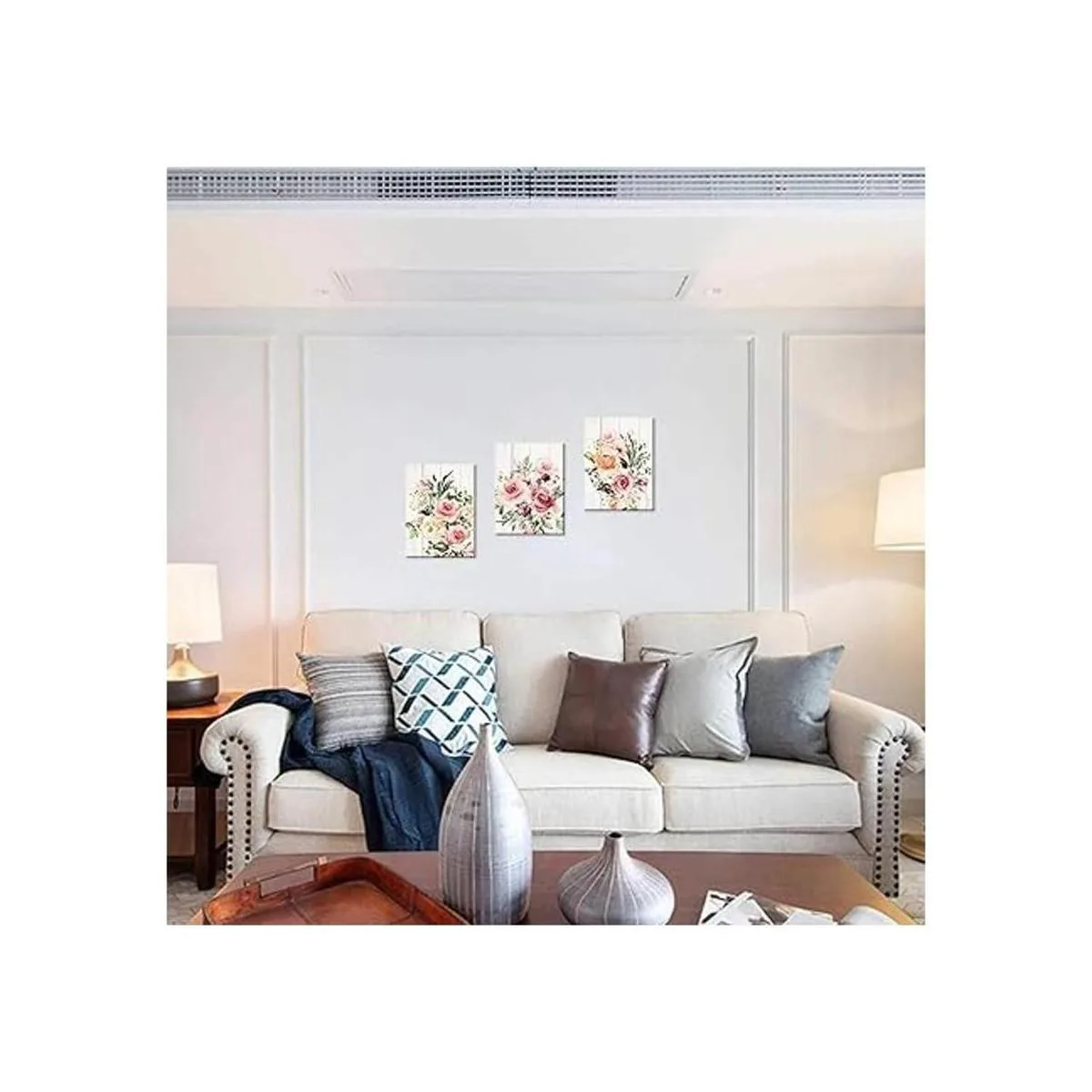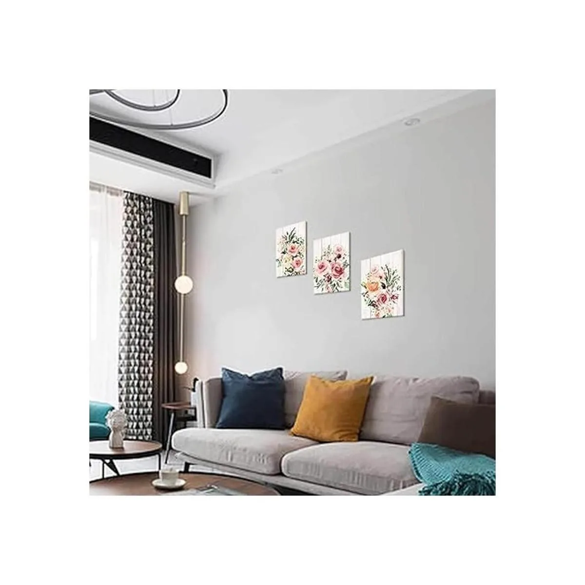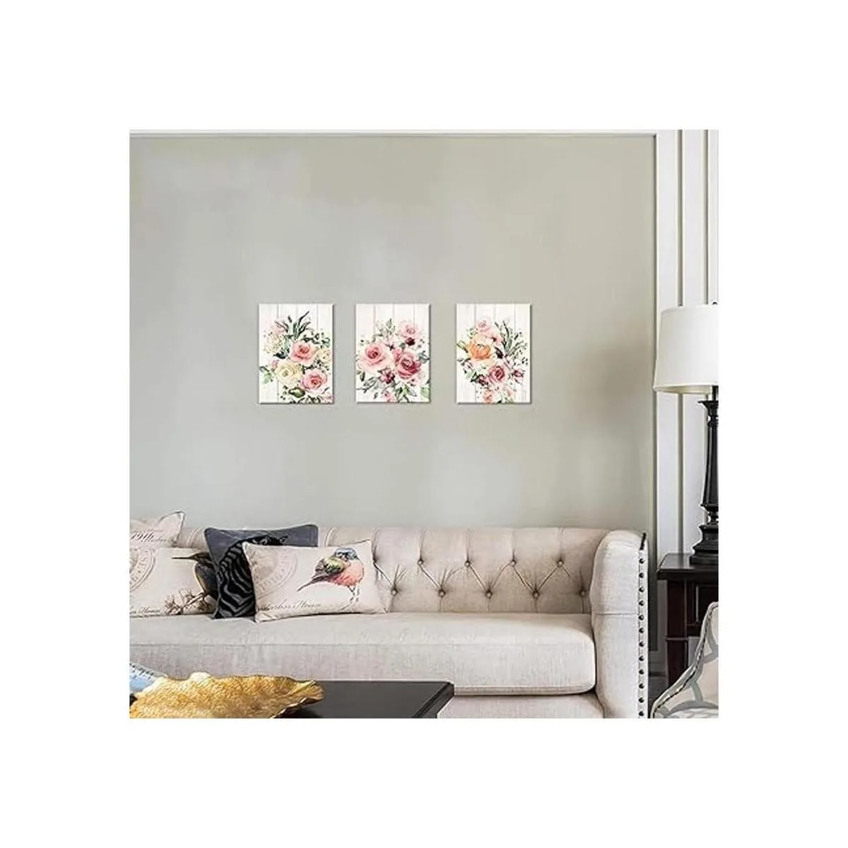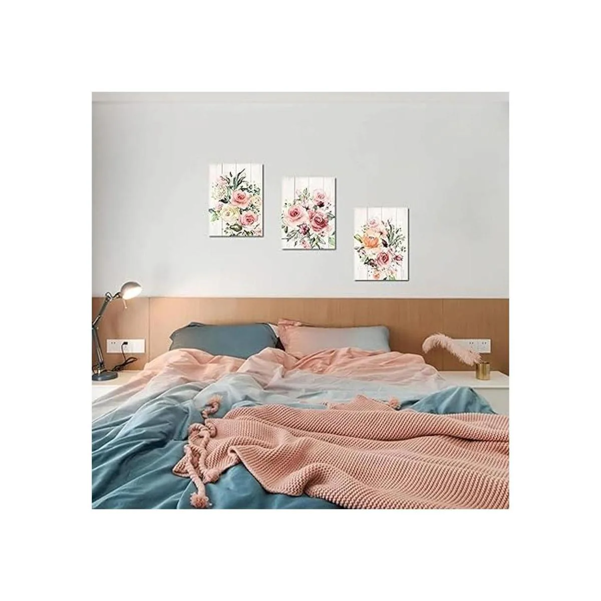 Arte de pared con diseño de flores rosas para decoración del hogar de baño, lienzo enmarcado para niñas, dormitorio, baño, fotos de grano de madera, cocina, decoración moderna de pared, arte colorido para decoración de paredes, tamaño 12 x 16 pulgadas cada panel