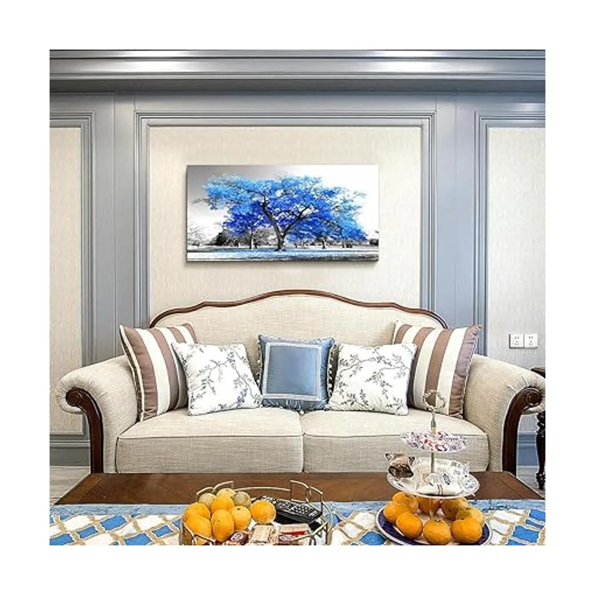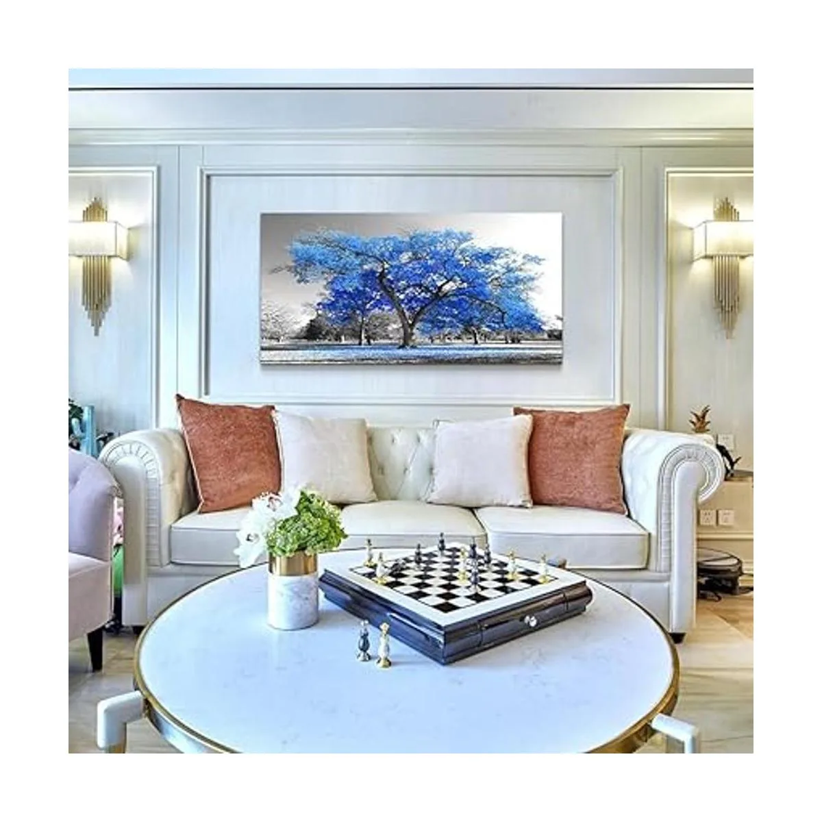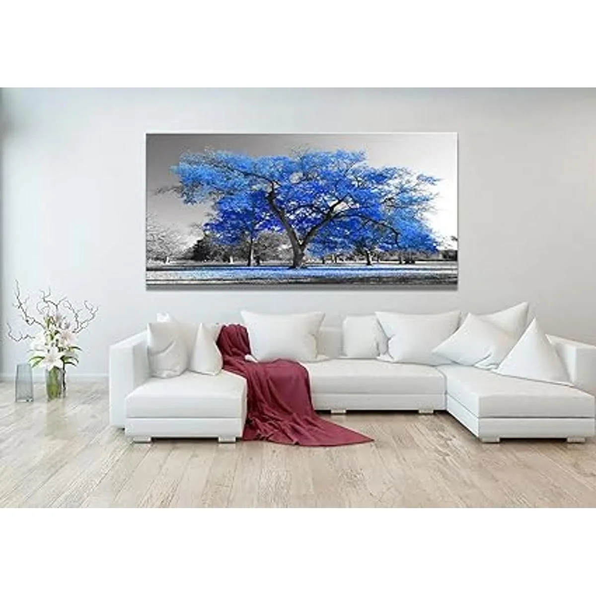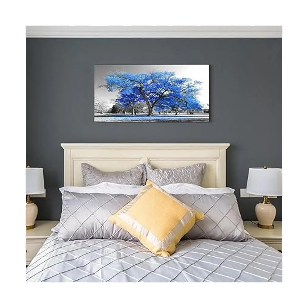 Arte de pared contemporáneo de árbol azul en blanco y negro, cuadro de paisaje de otoño moderno giclée estirado y enmarcado