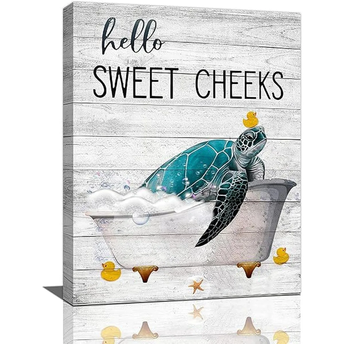 Arte de pared de baño de tortuga marina verde azulado con imágenes de tortuga marina divertida en la bañera, lienzo de arte con estampado de animales marinos marinos marinos, decoración de baño marcada de 12 x 16 pulgadas