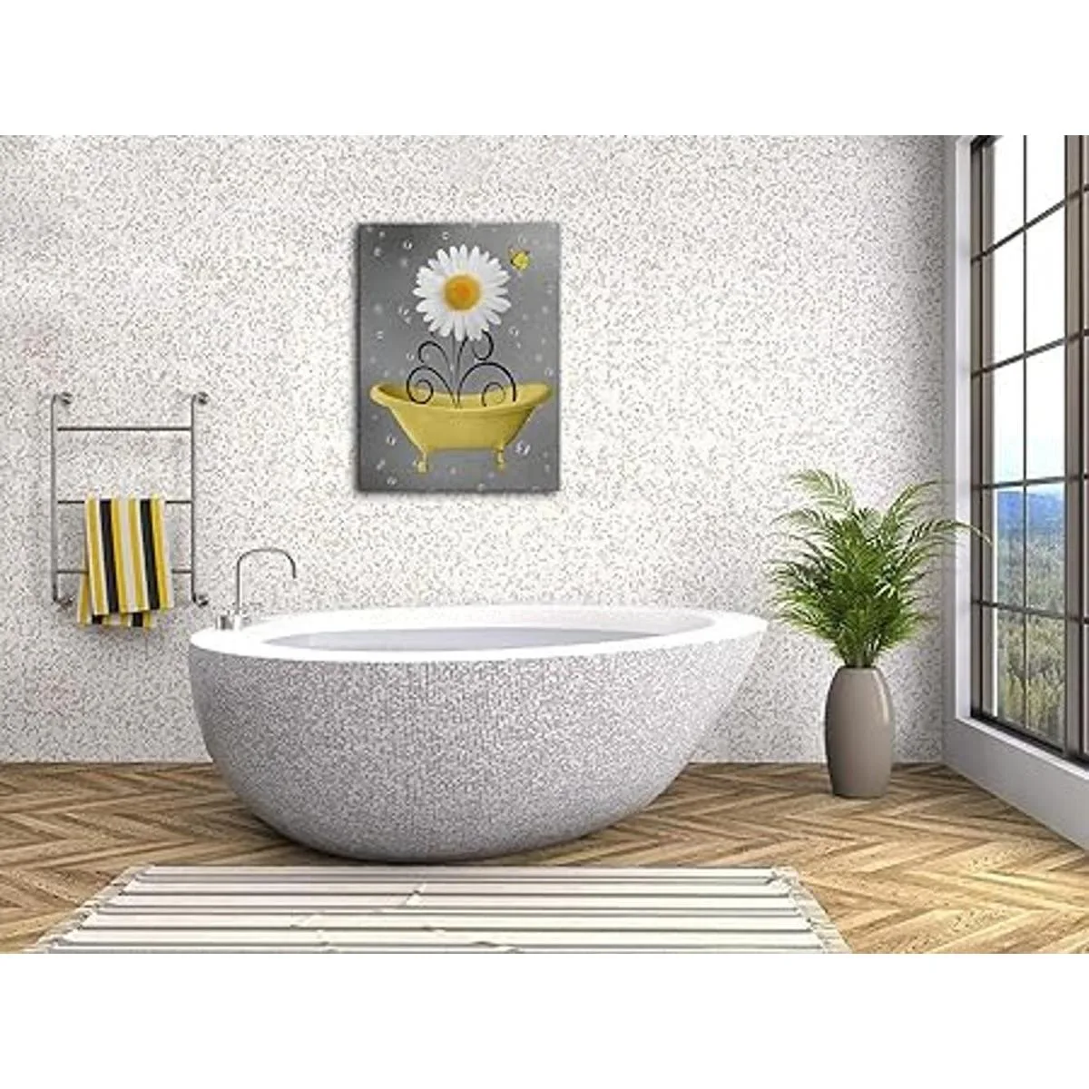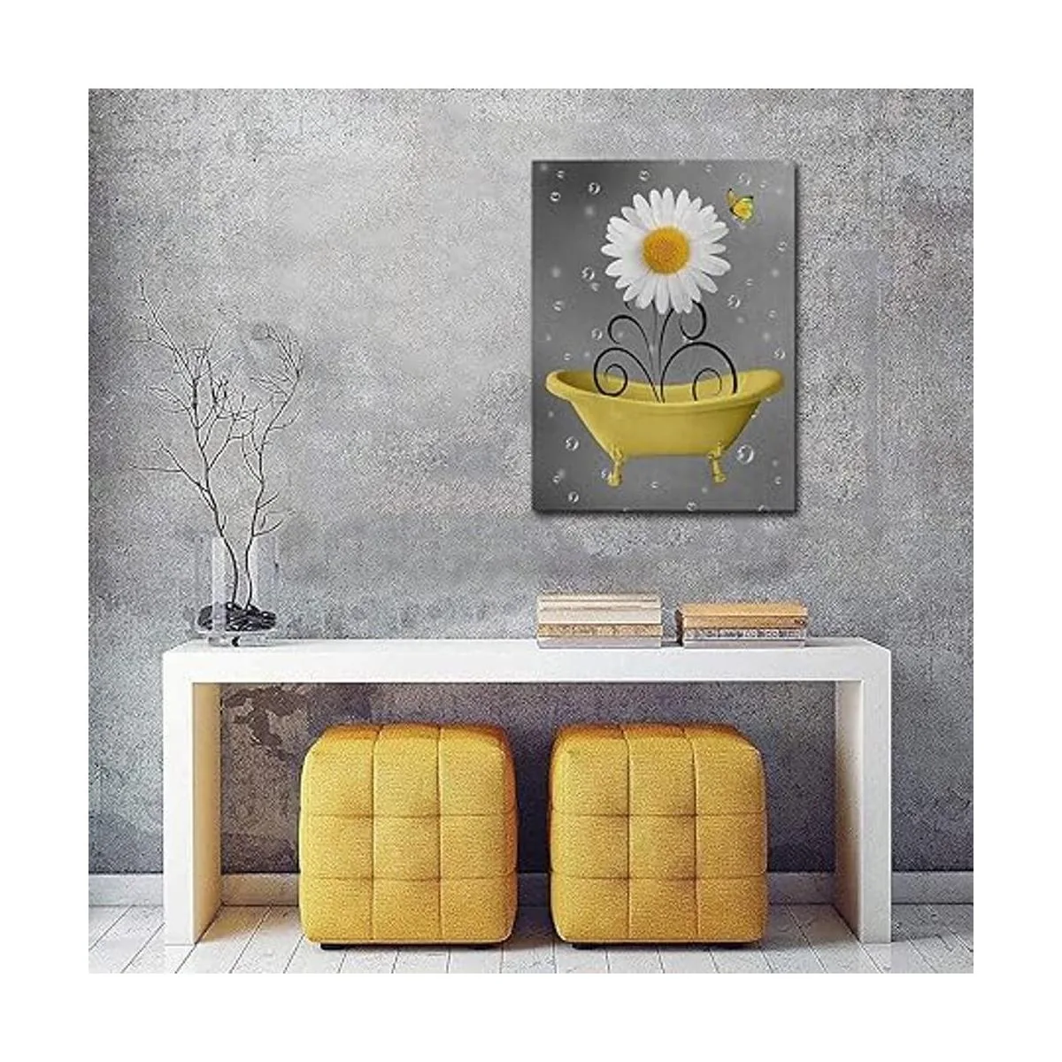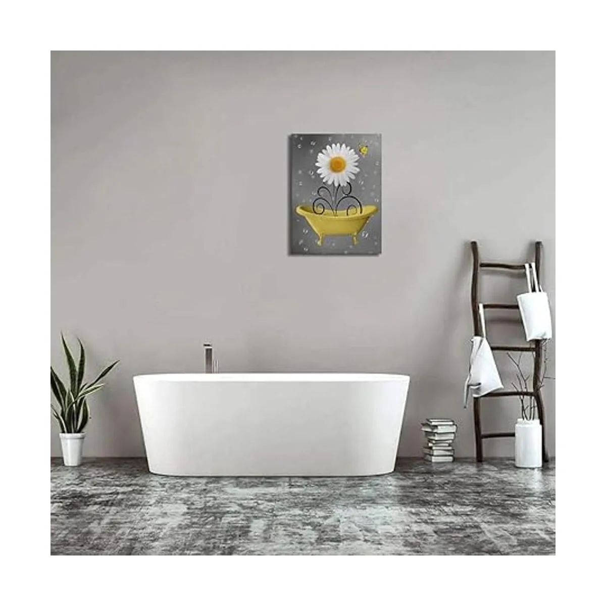 Arte de pared de baño, lienzo de margaritas, ilustraciones modernas de tina, fondo de madera rústica, arte contemporáneo de pared para dormitorio, sala de estar, oficina, hogar, enmarcado listo para colgar, amarillo, 12 x 16 pulgadas