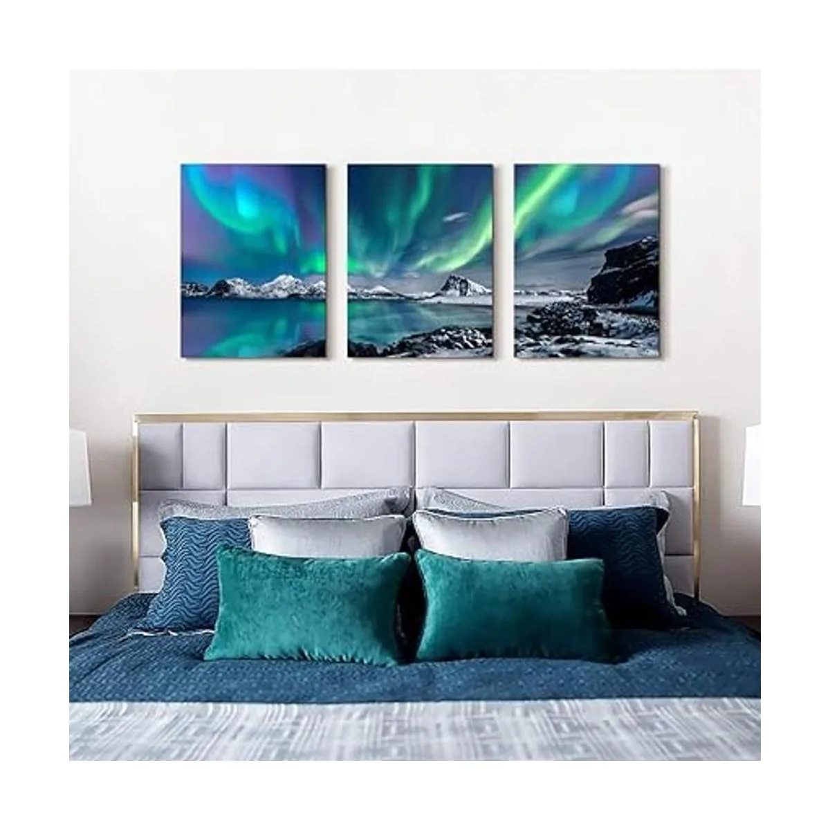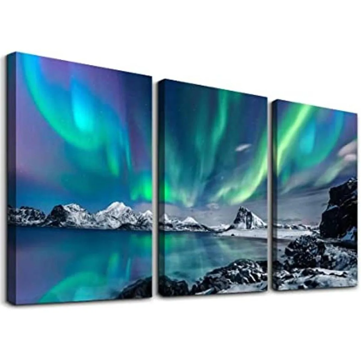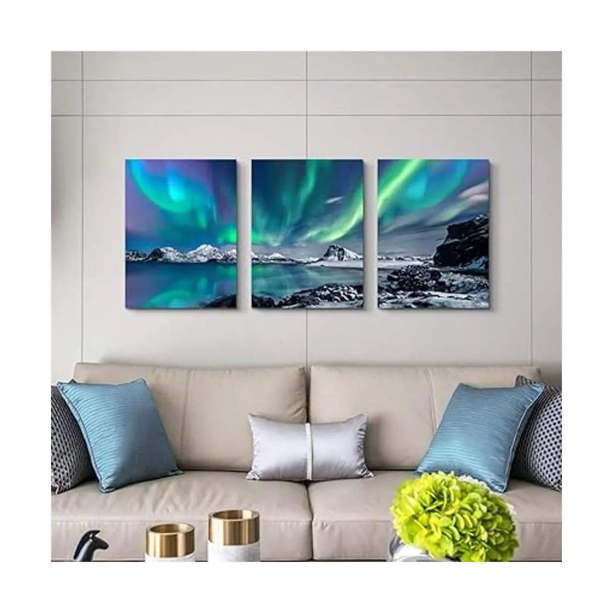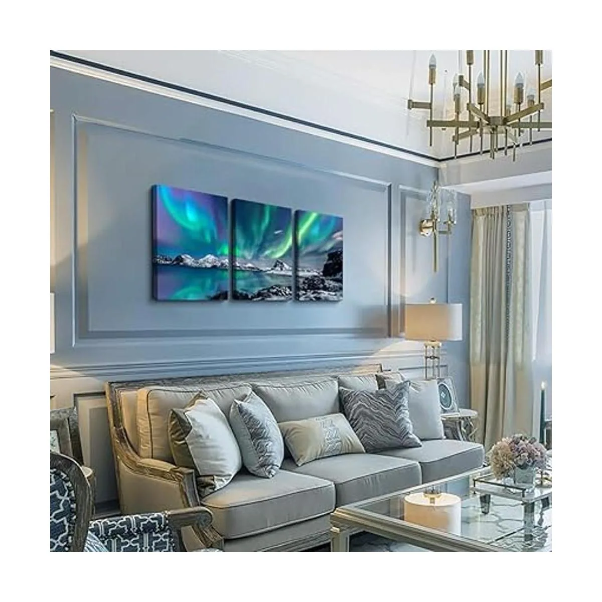 Arte de pared de casa de campo, pintura de paisaje de Aurora, decoración de pared para sala de estar, pinturas de lienzo estiradas y enmarcadas, decoración de pared de 3 piezas para dormitorio, baño, listo para colgar para la oficina, decoración del hogar, arte