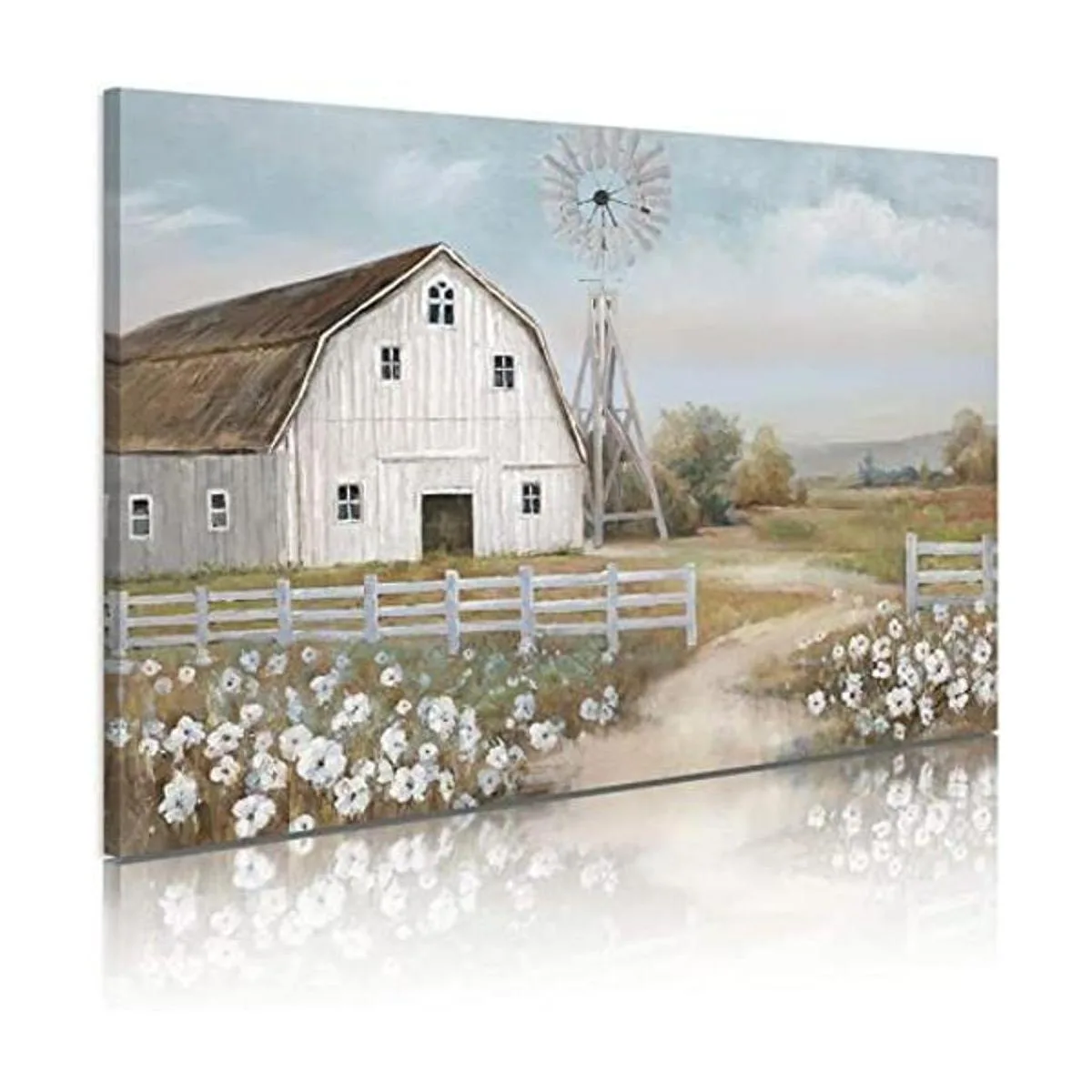 Arte de pared de granero antiguo pintado a mano, granero y flores, decoración de pared rústica para dormitorio, decoración de pared de granja, granero, molinos de viento para baño, dormitorio, sala de estar, enmarcado listo para colgar 16 x 12 pulgadas