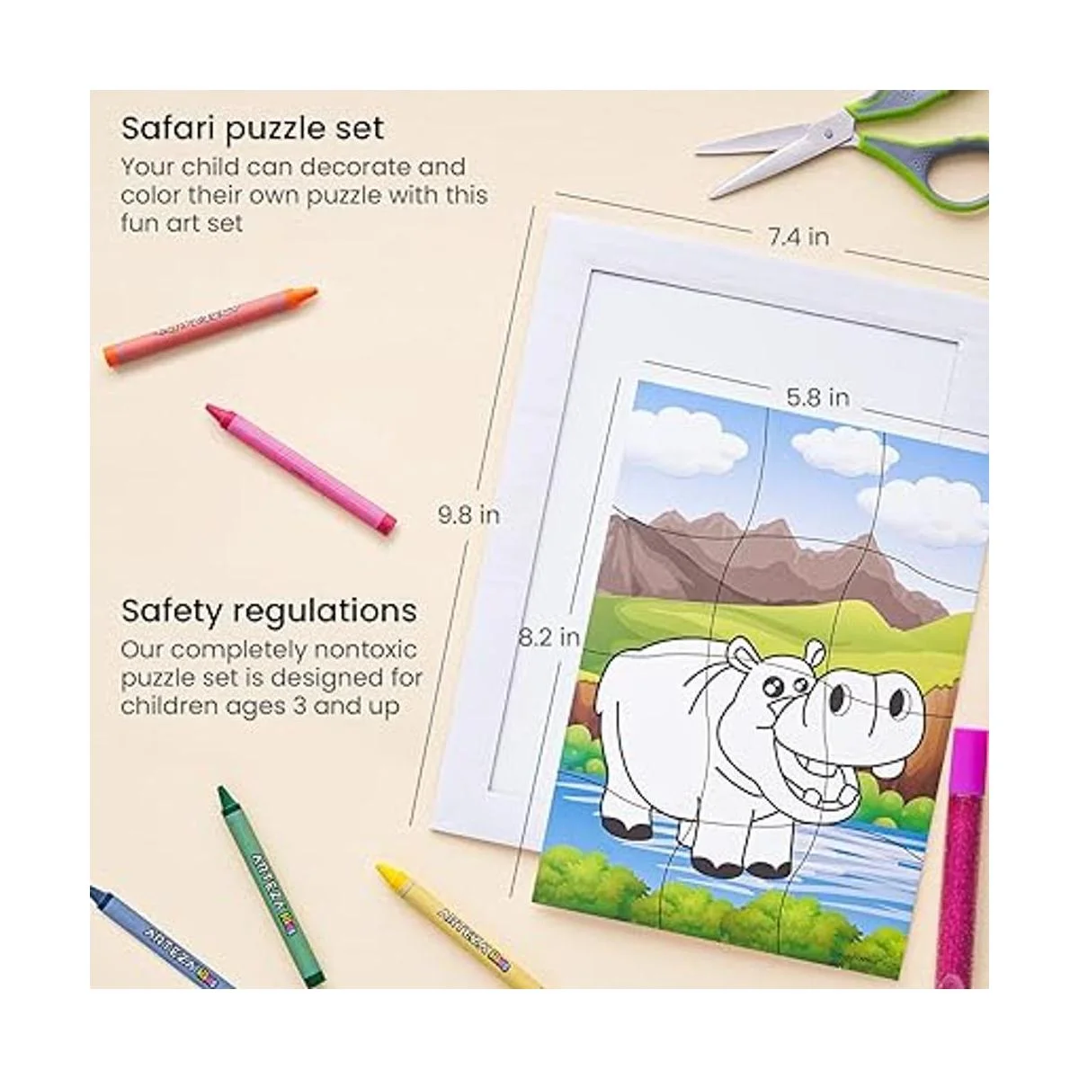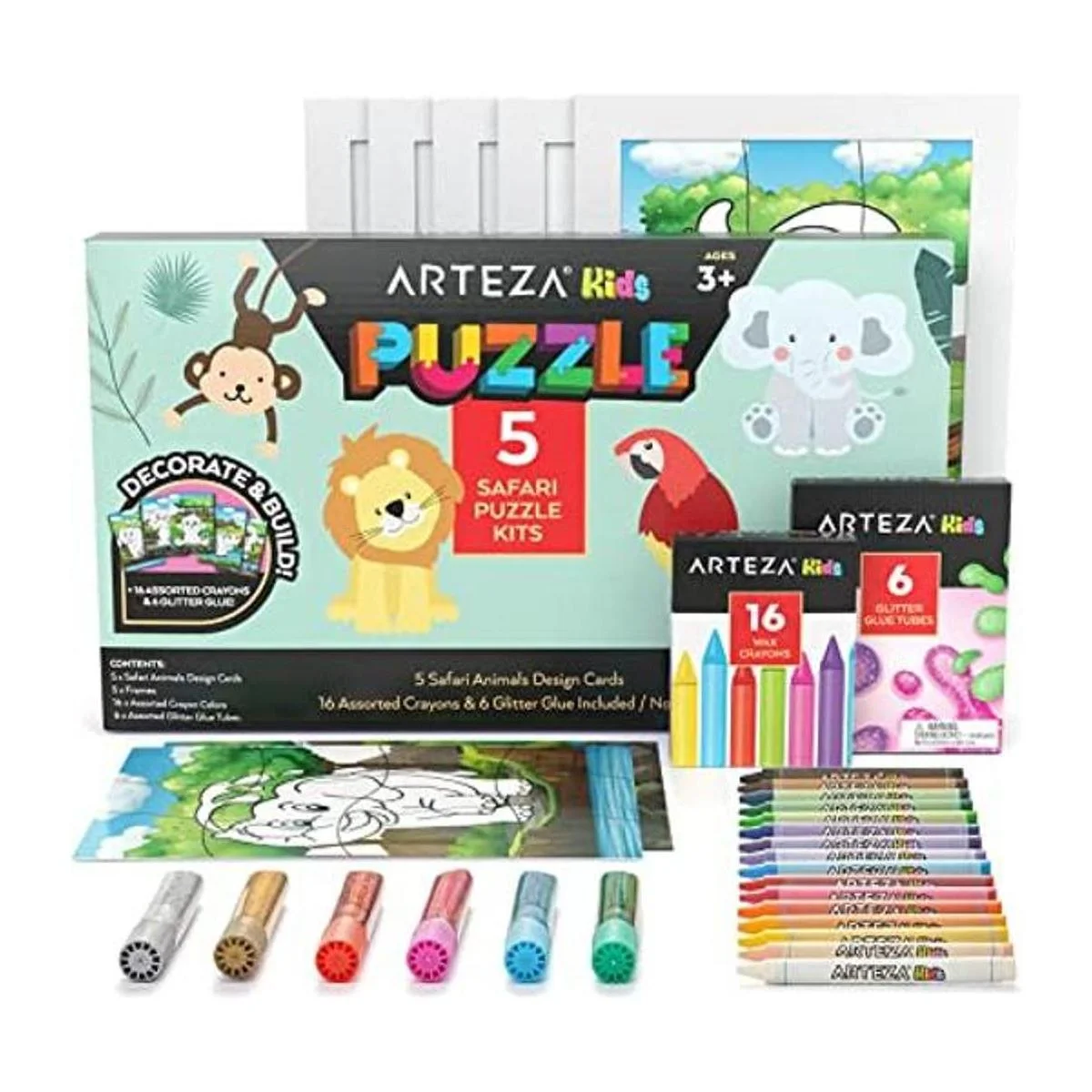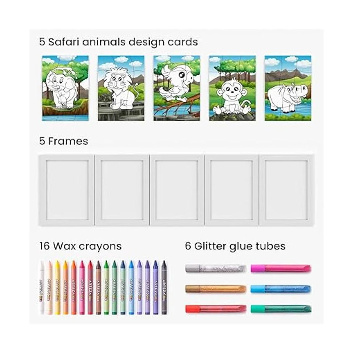 Arteza Kids Kit para colorear, 5 rompecabezas de safari, 16 crayones, 6 tubos de pegamento con purpurina, 5 marcos, actividades para niños de bricolaje y sin pantalla, suministros de manualidades y arte para niños de 3 años en adelante