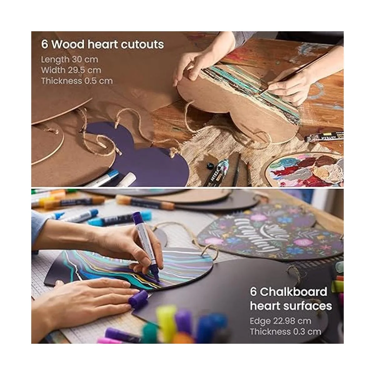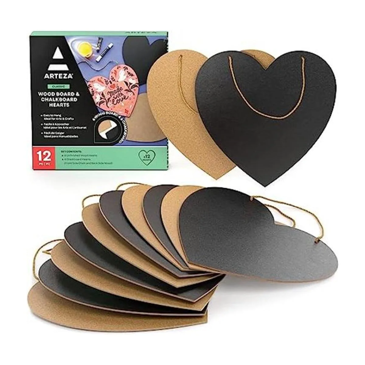 Arteza Pizarra y corazones de madera, 12 piezas, corazones MDF de 11.6 x 11.8 pulgadas y corazones de pizarra de 11.6 x 11.4 pulgadas, letreros de madera sin terminar con cordones, suministros de manualidades para bricolaje y decoración del hogar