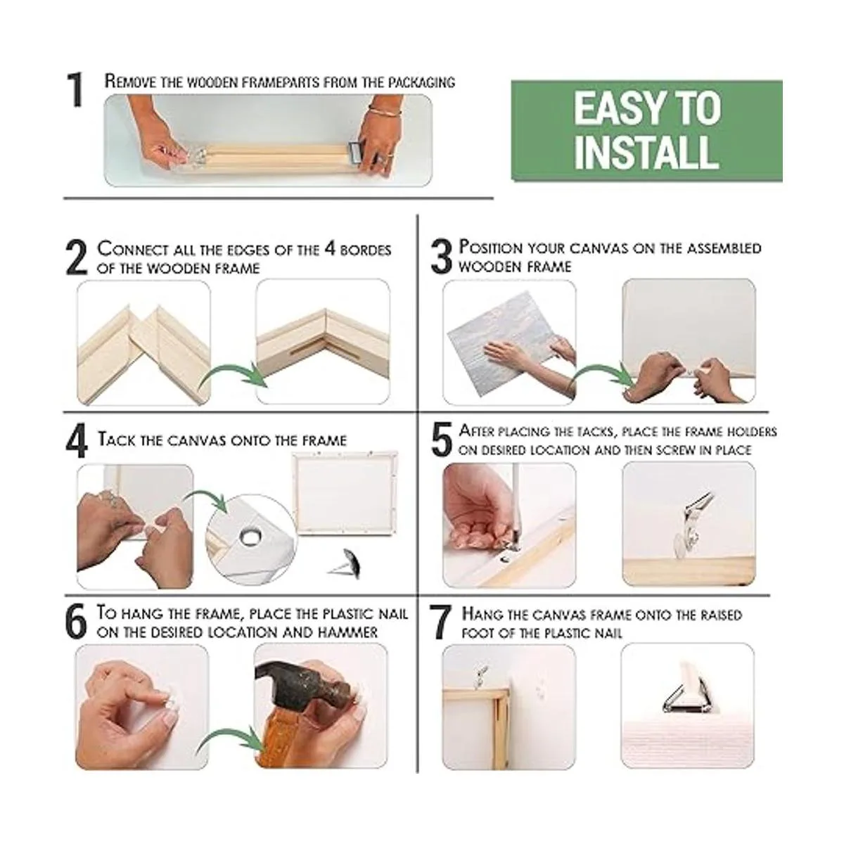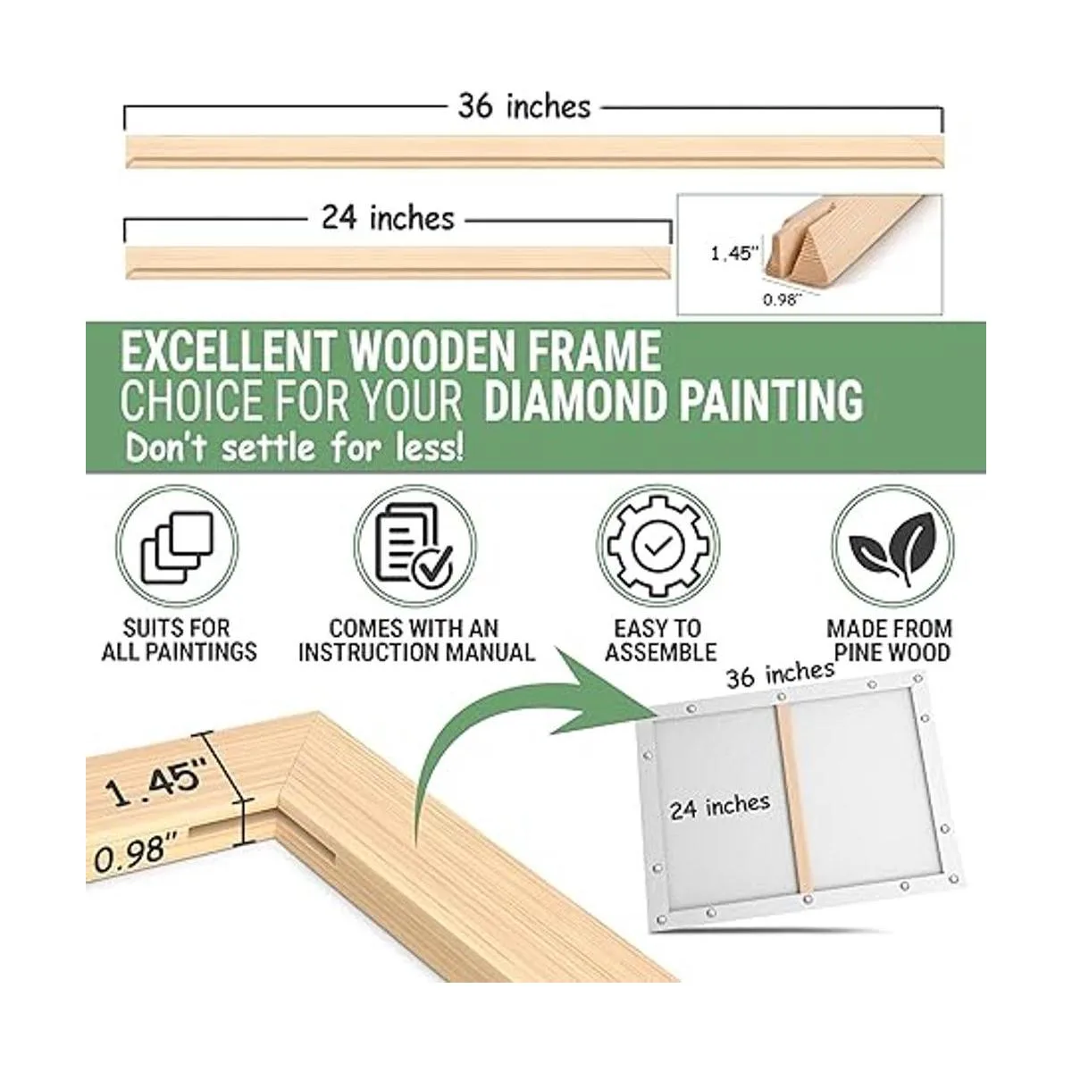 Fácil de montar: solo tienes que seguir nuestro manual de instrucciones fácil de entender para poner rápidamente estas barras de madera de pino juntas, y listo: tienes un marco ligero pero resistente que mostrará cualquier obra de arte de 24 x 36 pulgadas