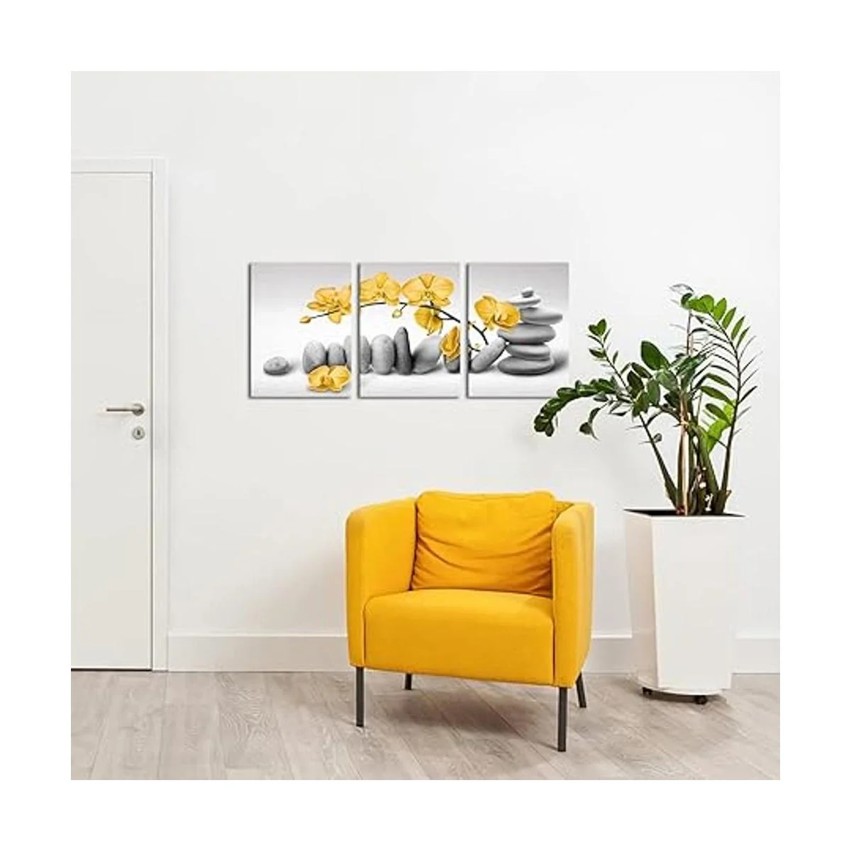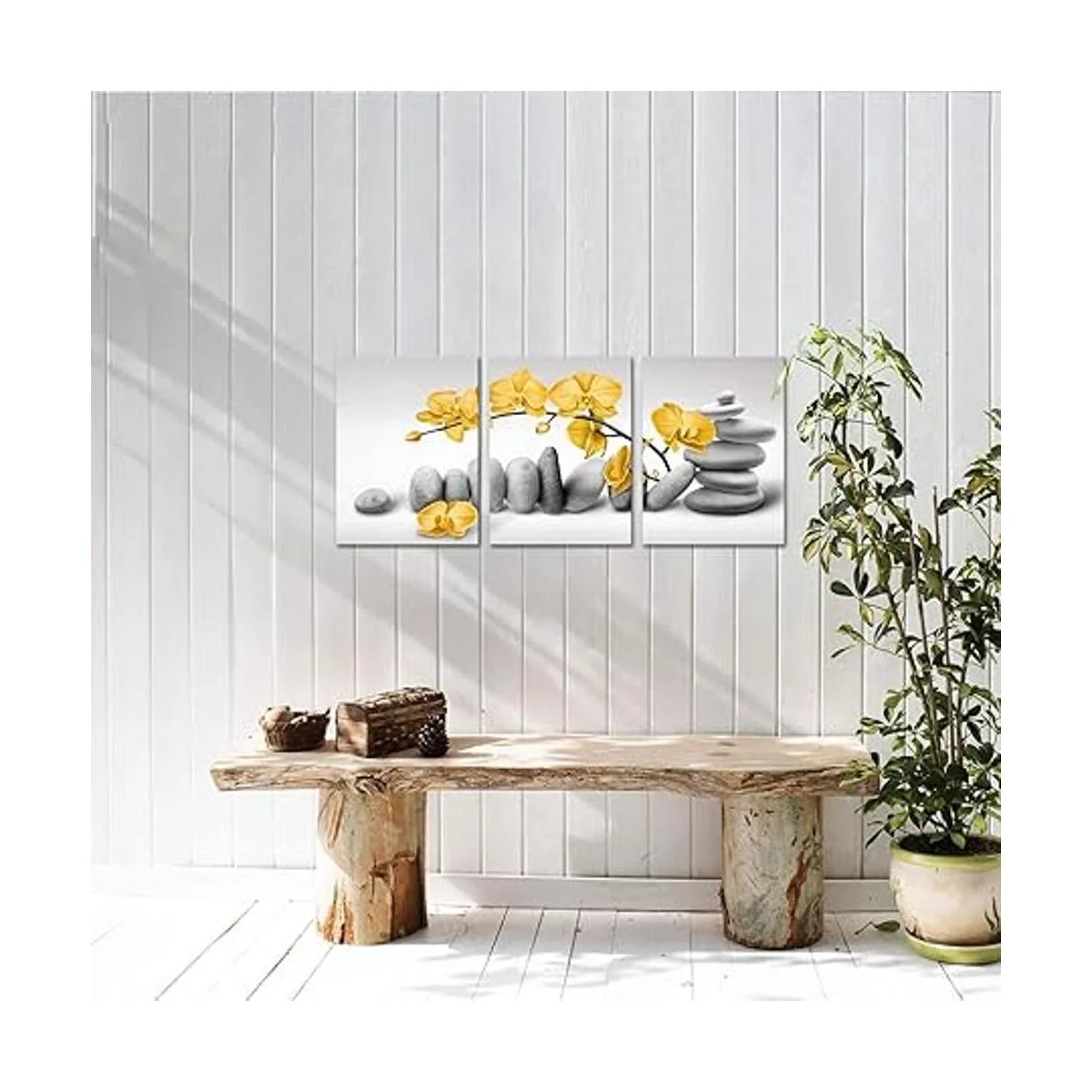 Artmyharbor Arte de pared Zen de 3 piezas, color gris, amarillo, orquídeas, flores, pintura de piedra, lienzo, para relajación, spa, obras de arte enmarcadas para el hogar, sala de meditación, baño, yoga, decoración de sala de yoga, lista para colgar