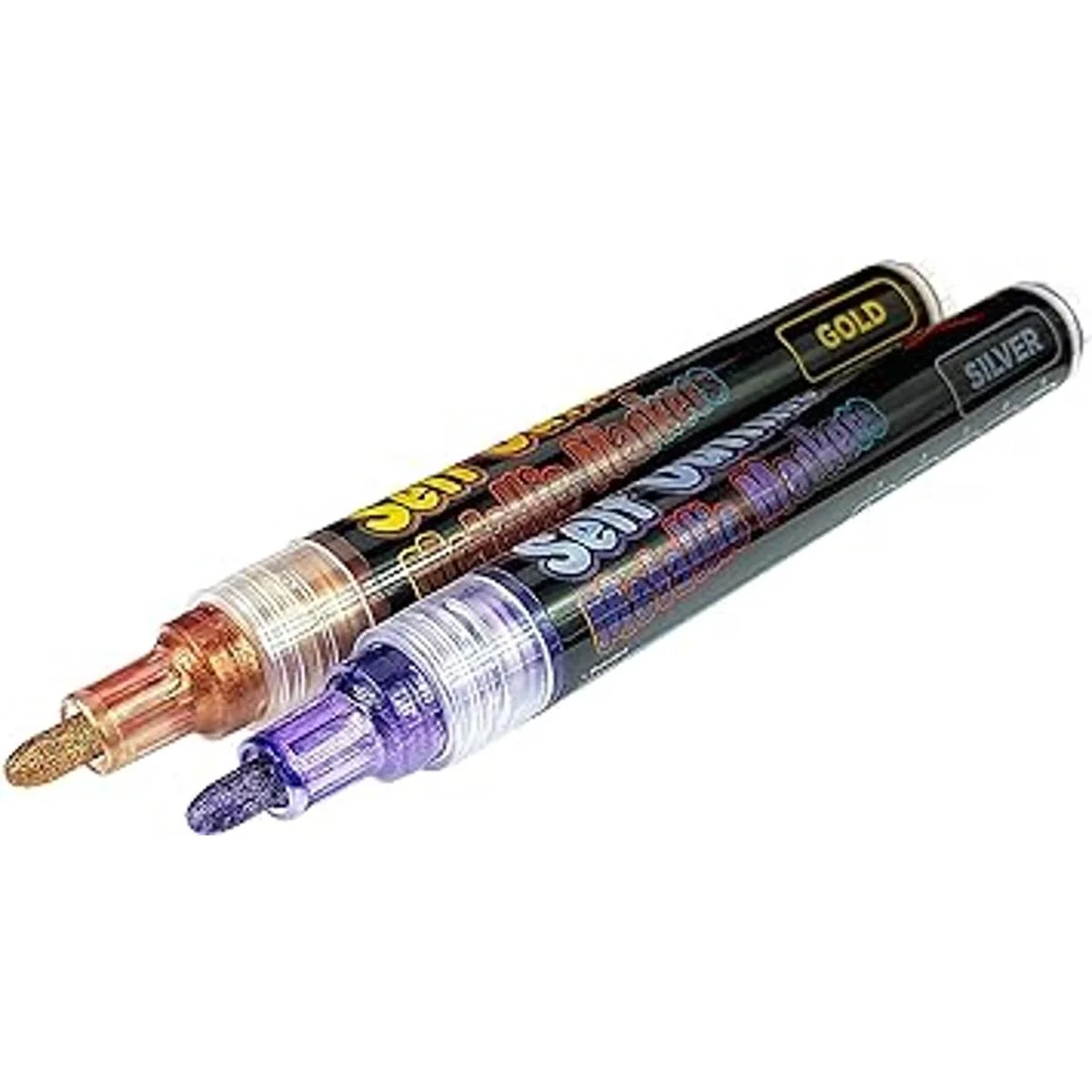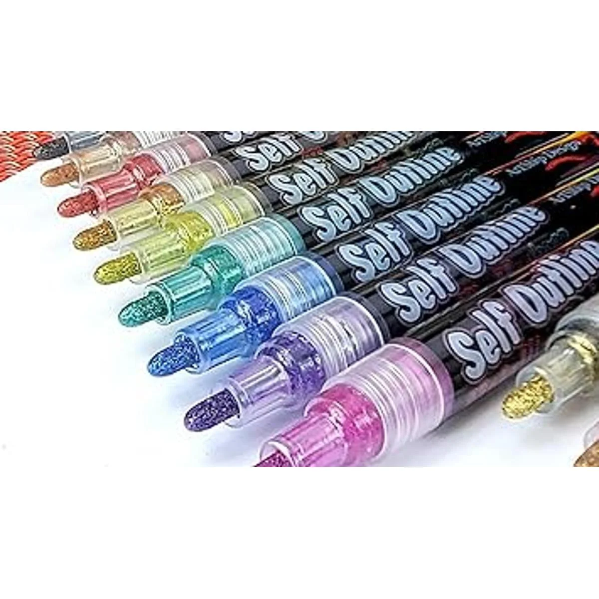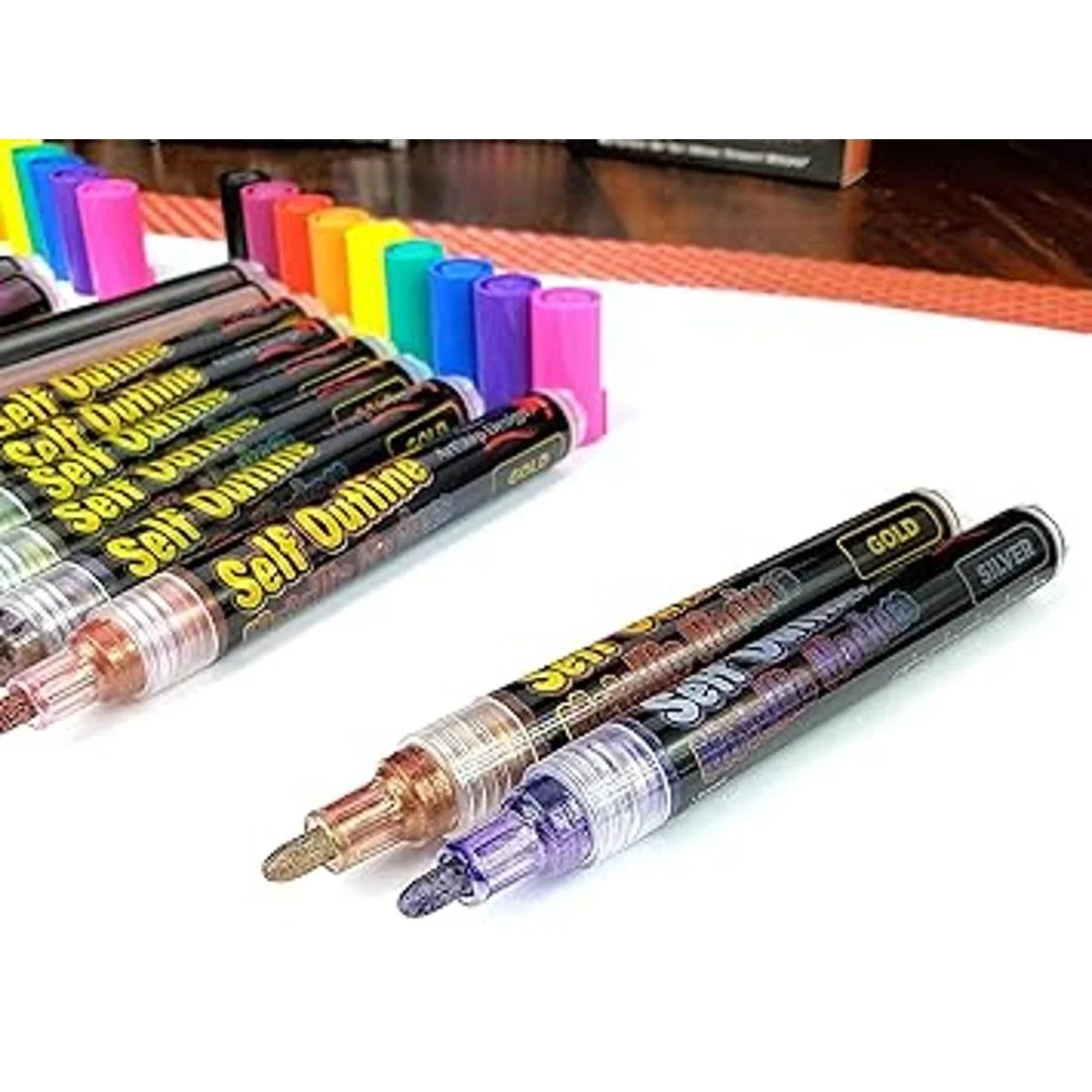SELFOUTLINING, DOUBLE LINE PENS: These Shimmer Markers simultaneously apply two layers of paint. The base layer is a thick, shimmering silver or gold metallic. A second layer of brightly colored outline paint is applied at the same time. This outline paint is lighter and automatically spreads to the edge of the lines you draw, creating a unique, colorful outline