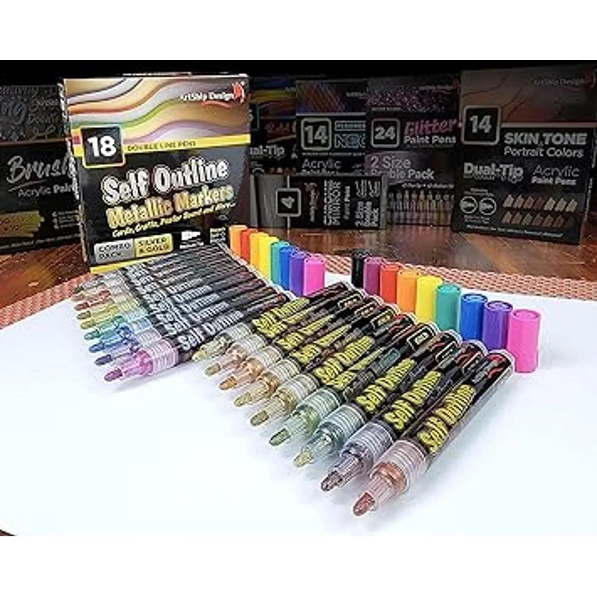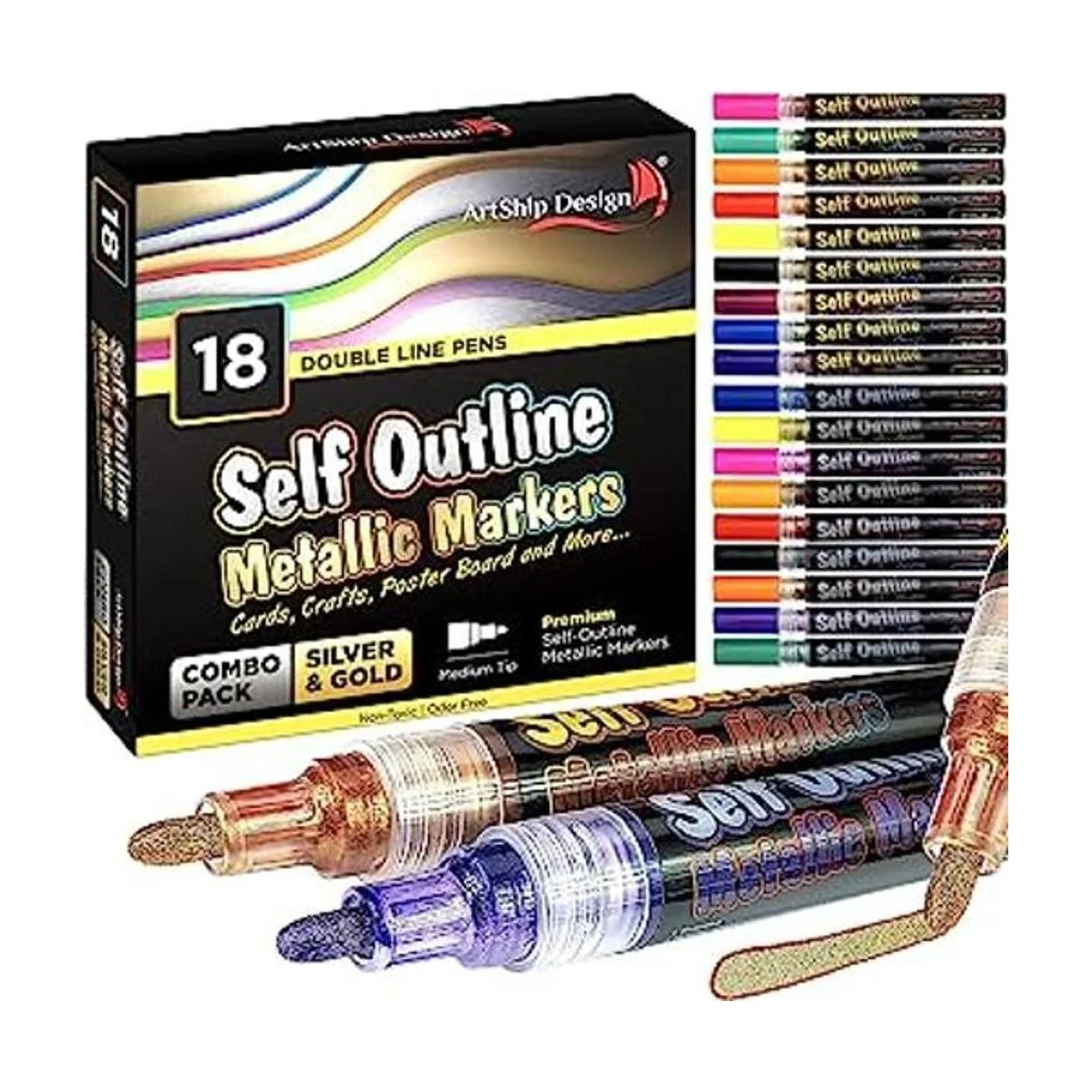ArtShip Design 18 Gold Silver Self Outline Metallic Shimmer Paint Pen Combo Pack Extra Large Barrels Permanent Double Line Markers Journal Pens, Scrap Booking, Cards, DIY Crafts, Posters, Cards