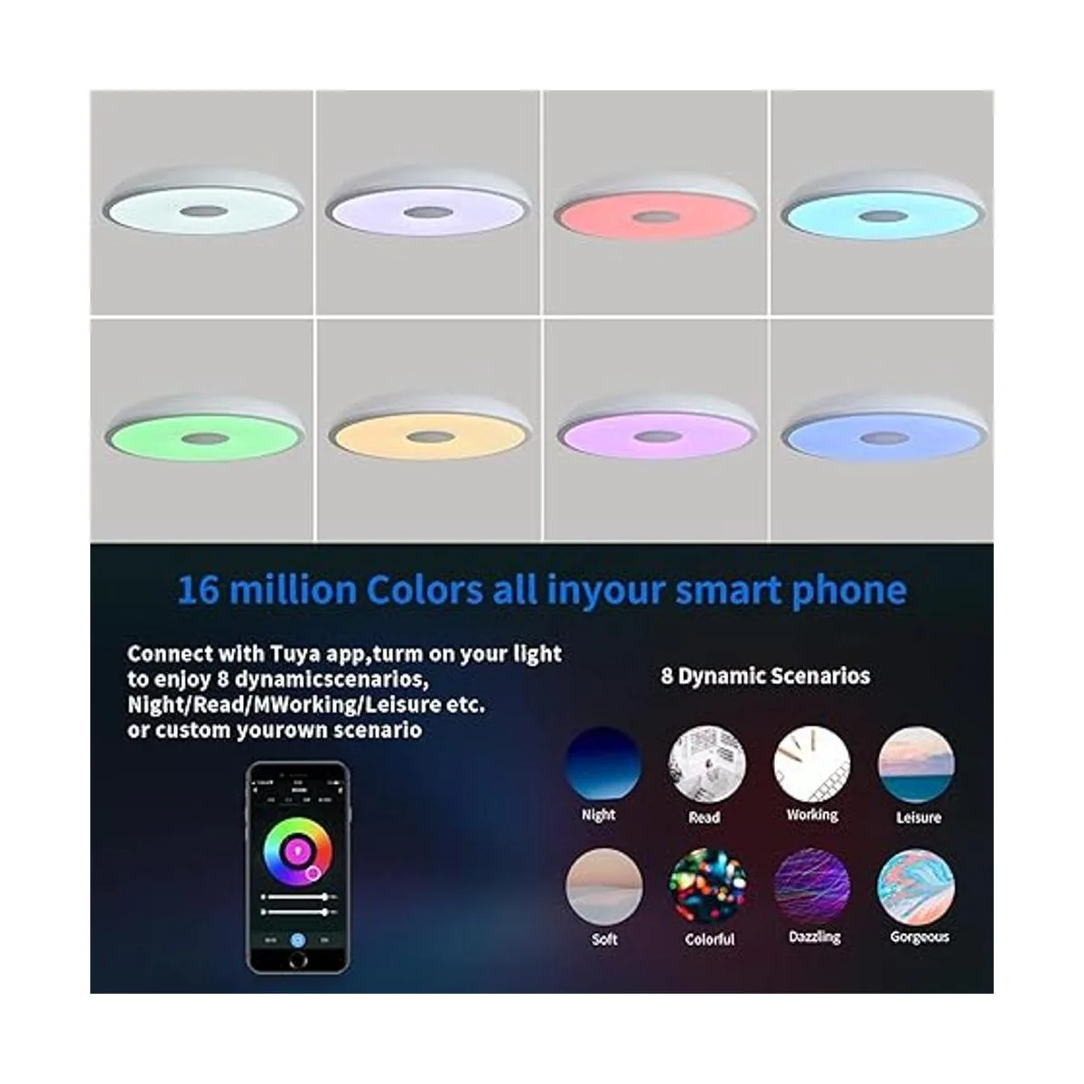 Soporte multifunción: utiliza control remoto, aplicación Tuya o control de voz para seleccionar efecto de temperatura de color de 2700 K4000 K6500 K, y la función de ajuste de brillo es del 1 al 100. Modo de protección ocular de luz nocturna, modo de escena, función de sincronización y modo RGB de color satisfacen tu elección en diferentes escenas.