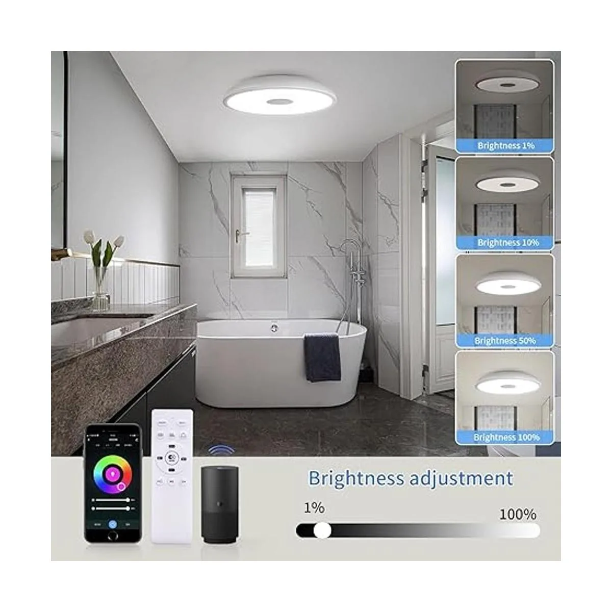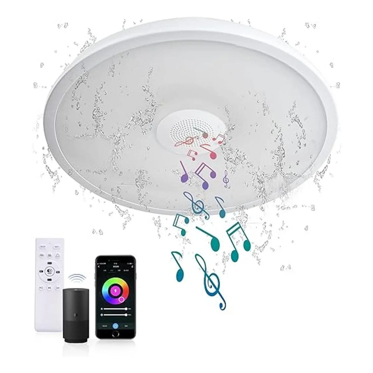 ASALL Lámpara de techo impermeable inteligente de 11 pulgadas LED de 18 W con altavoz Bluetooth, función de cambio de color RGB 2700 k6500 k regulable, control de aplicación Tuya, compatible con Alexa Google Home