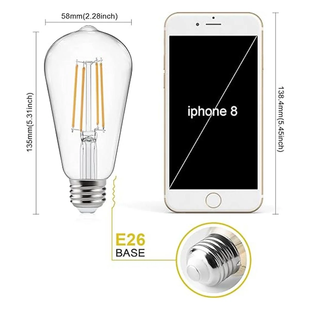 Ascher Bombillas LED de estilo vintage que imitan una bombilla antigua incandescente, equivalente a 60 W, protegen la vista, con un CRI de 95, no regulable, luz cálida blanca brillante de 2700 K, bombillas con filamentos LED de estilo clásico, bombilla Edison ST58, para bases medianas E26, paquete de 6