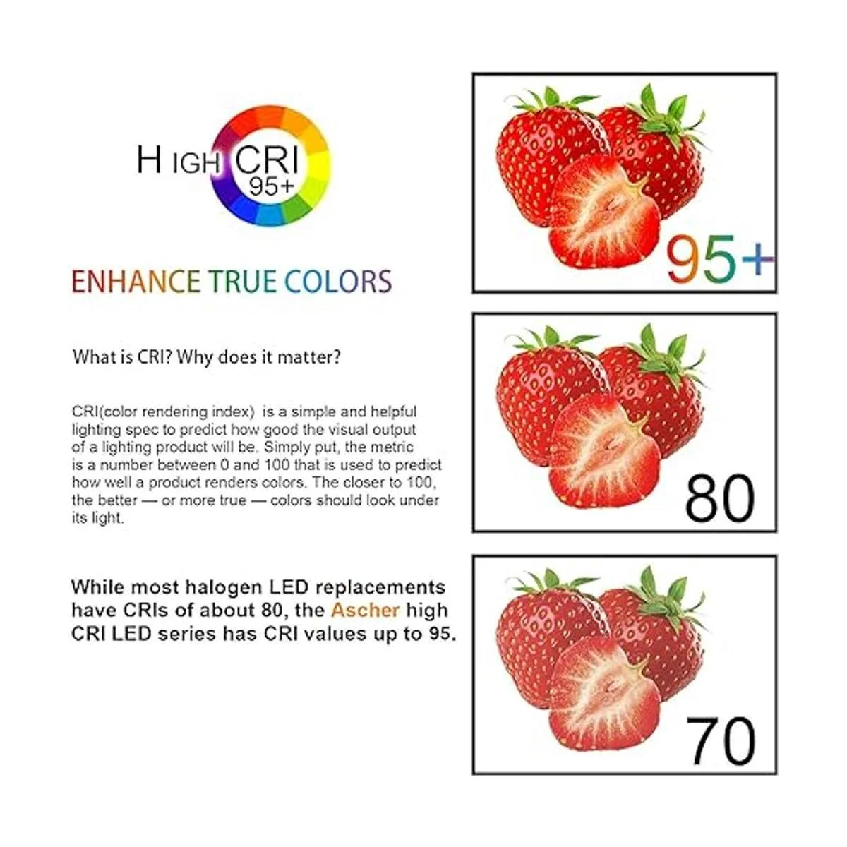 Alto índice de reproducción cromática: la bombilla LED de la marca Ascher de alto IRC más de 95 puede mejorar el interior de tu hogar y hacer que los colores se vean más vivos. Además, esta bombilla es muy duradera y será igual de eficiente durante toda su vida útil.