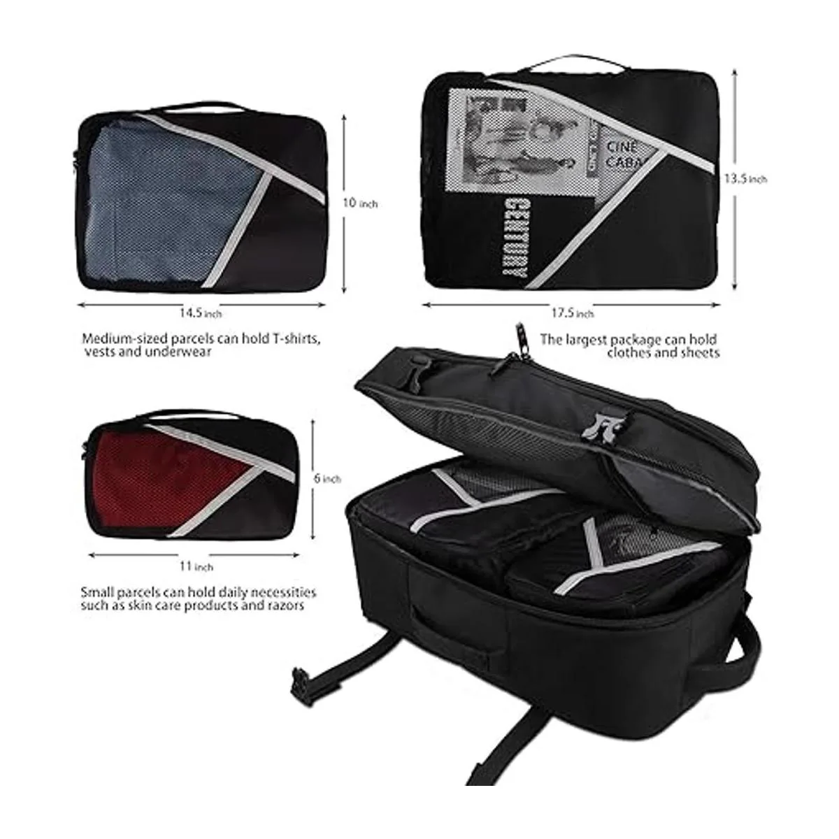 Transporte y viaje: La mochila grande lleva 3 bolsas de almacenamiento hechas a medida, que pueden mejorar la calidad de tu viaje. El tamaño total cumple con los estándares de tamaño para el avión, y la apertura de cremallera portátil te facilita pasar rápidamente el control de seguridad del aeropuerto. Tiene bandas elásticas integradas para evitar que tu ropa se caiga.