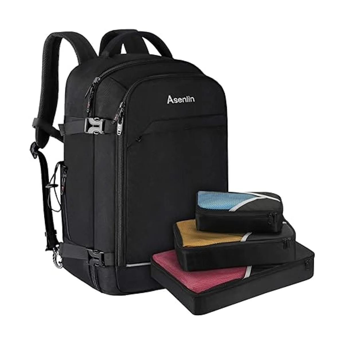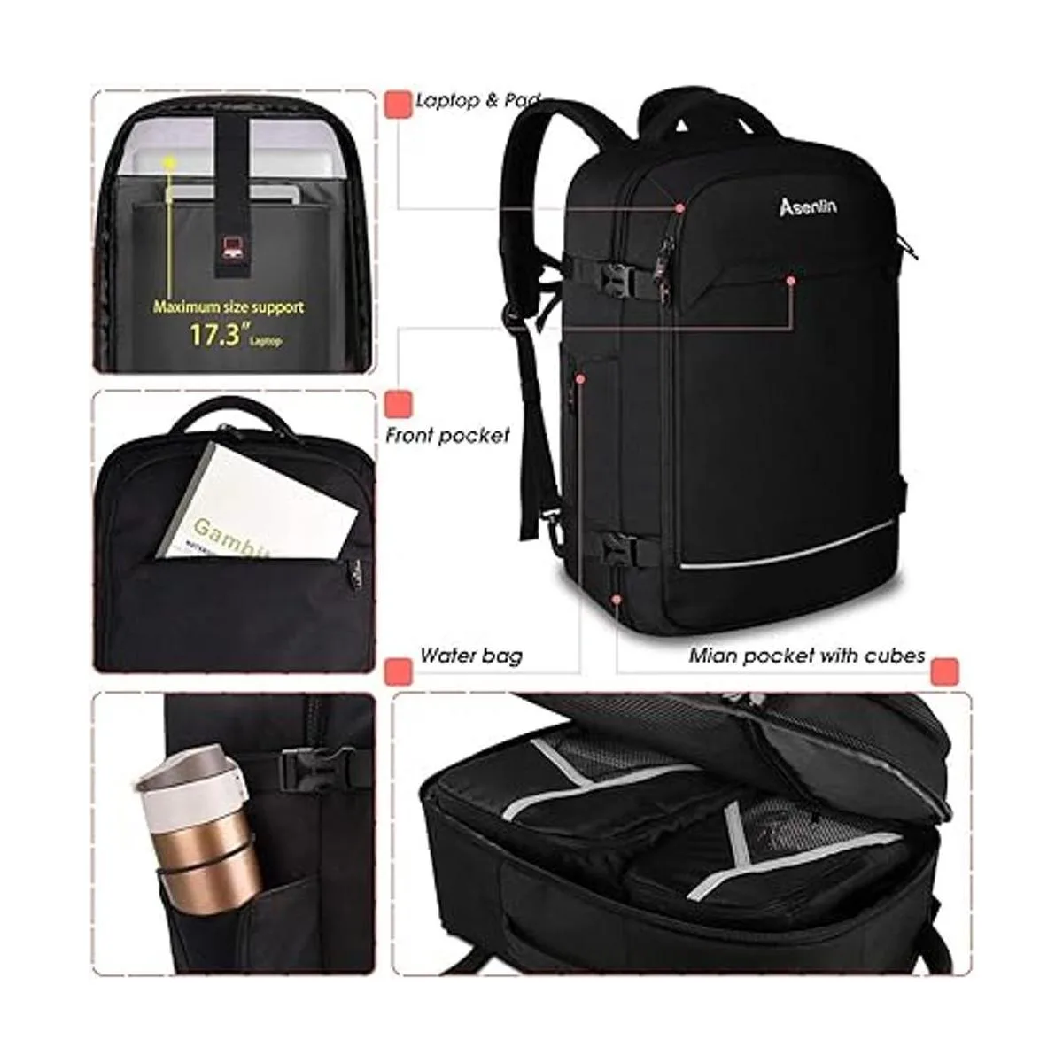 Asenlin 40L Mochila de viaje para mujeres y hombres, para laptop de 17 pulgadas, aprobada para vuelo, resistente al agua, mochila para computadora, para fin de semana, durante la noche, mochila grande, color negro