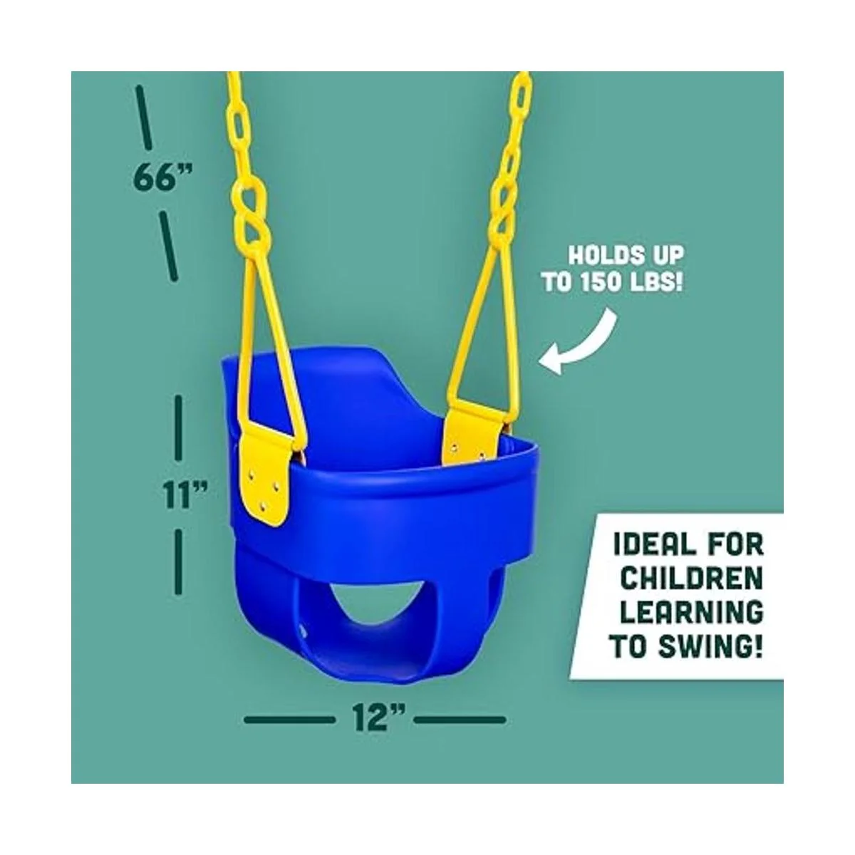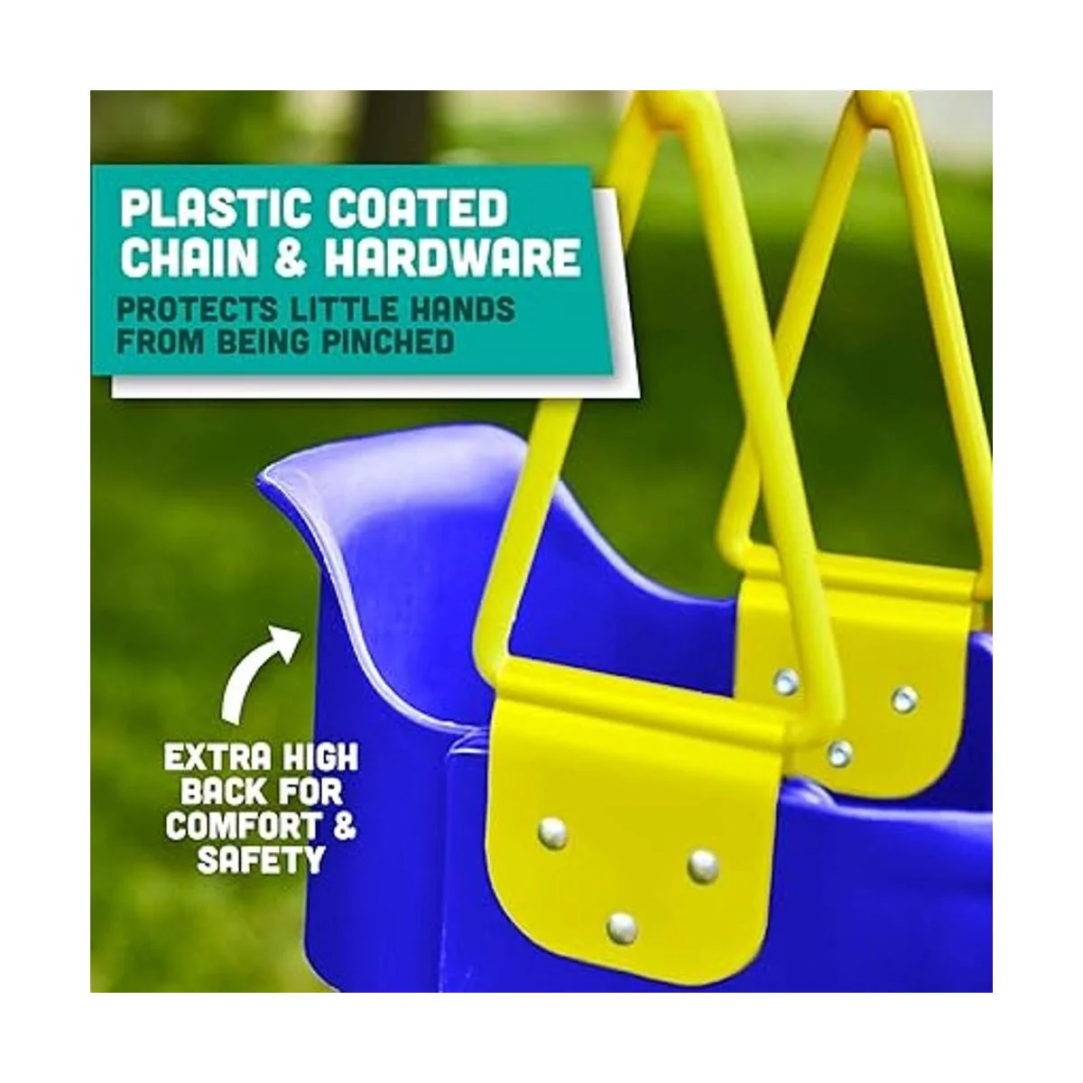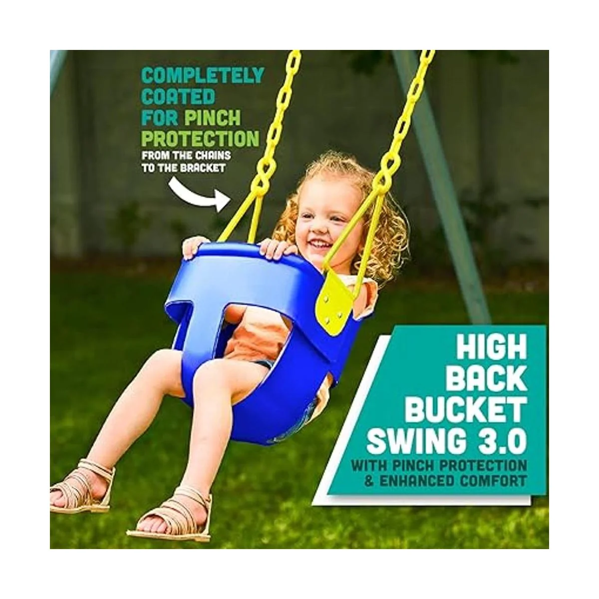 Columpio de respaldo alto: una divertida adición a cualquier juego o gimnasio de la selva, este columpio completo para niños pequeños tiene un diseño pendiente de patente con un agarre frontal enrollado, parte trasera curvada y cadenas recubiertas de plástico sin pellizcos.