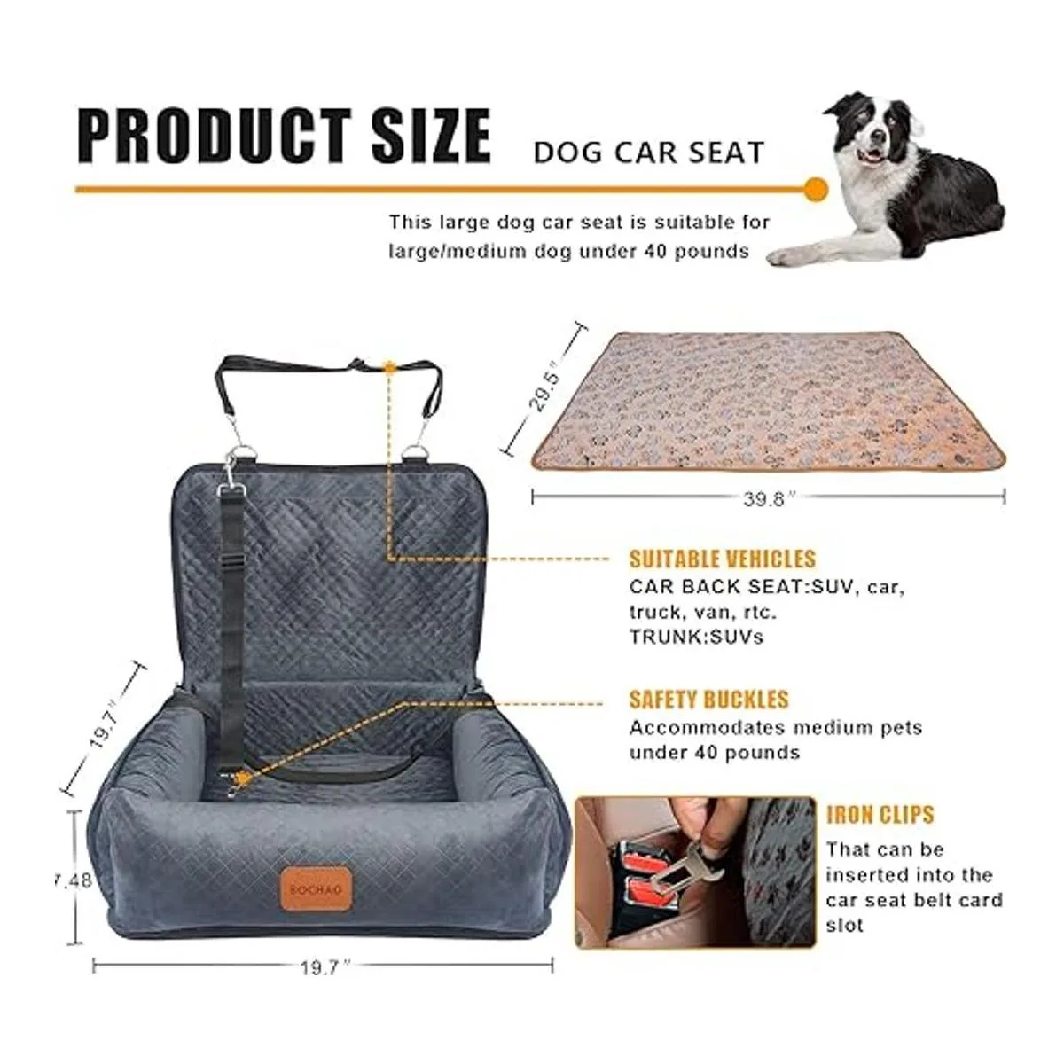 Tamaño del asiento de coche para mascotas: 19.7 pulgadas de largo x 19.7 pulgadas de ancho x 7.9 pulgadas de alto, adecuado para mascotas pequeñas y medianas de hasta 40 libras; adecuado para todo tipo de coches, no solo se puede instalar en el asiento delantero del coche, sino que también se puede instalar en el asiento trasero para usar.