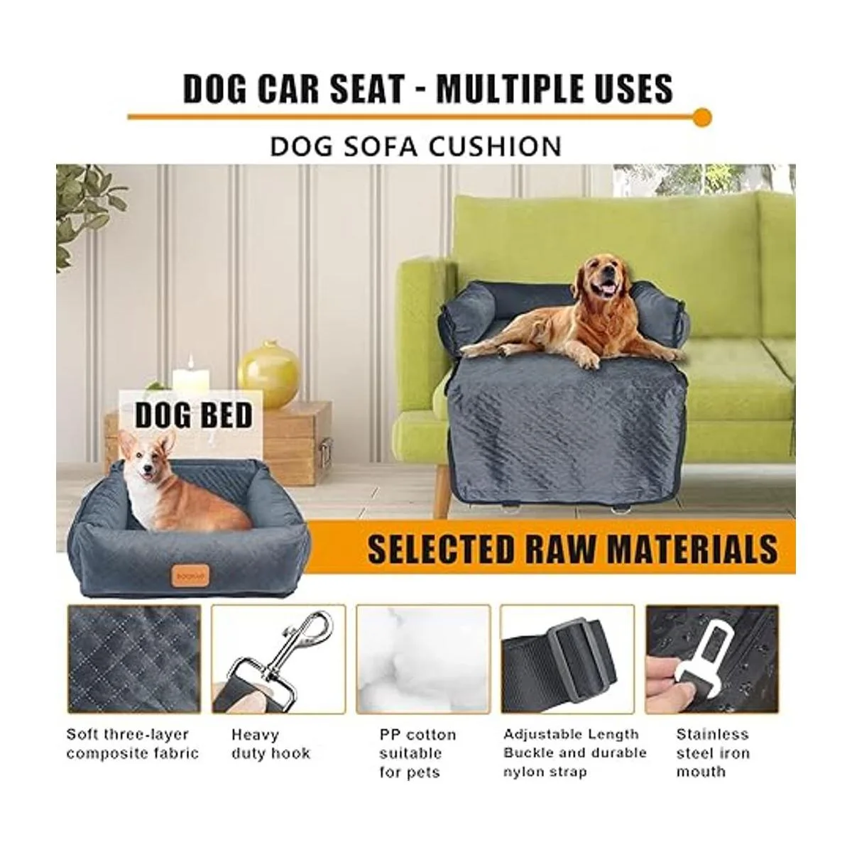 Uso multifuncional: asiento de coche para perro en ambos lados de la bolsa de almacenamiento, puedes almacenar suministros para mascotas, también puedes quitar el cinturón de seguridad en el bolsillo lateral, plegar el respaldo como un uso de cama para perro; también se puede utilizar en el sofá para proteger el sofá de daños por el perro.