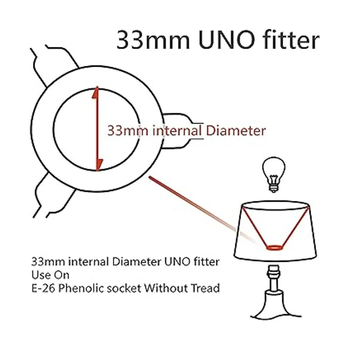 Las pantallas de lámpara UNO se ajustan solo a enchufes roscados fenólicos que miden 1 3/8 pulgadas de ancho anillos de enchufe no incluidos