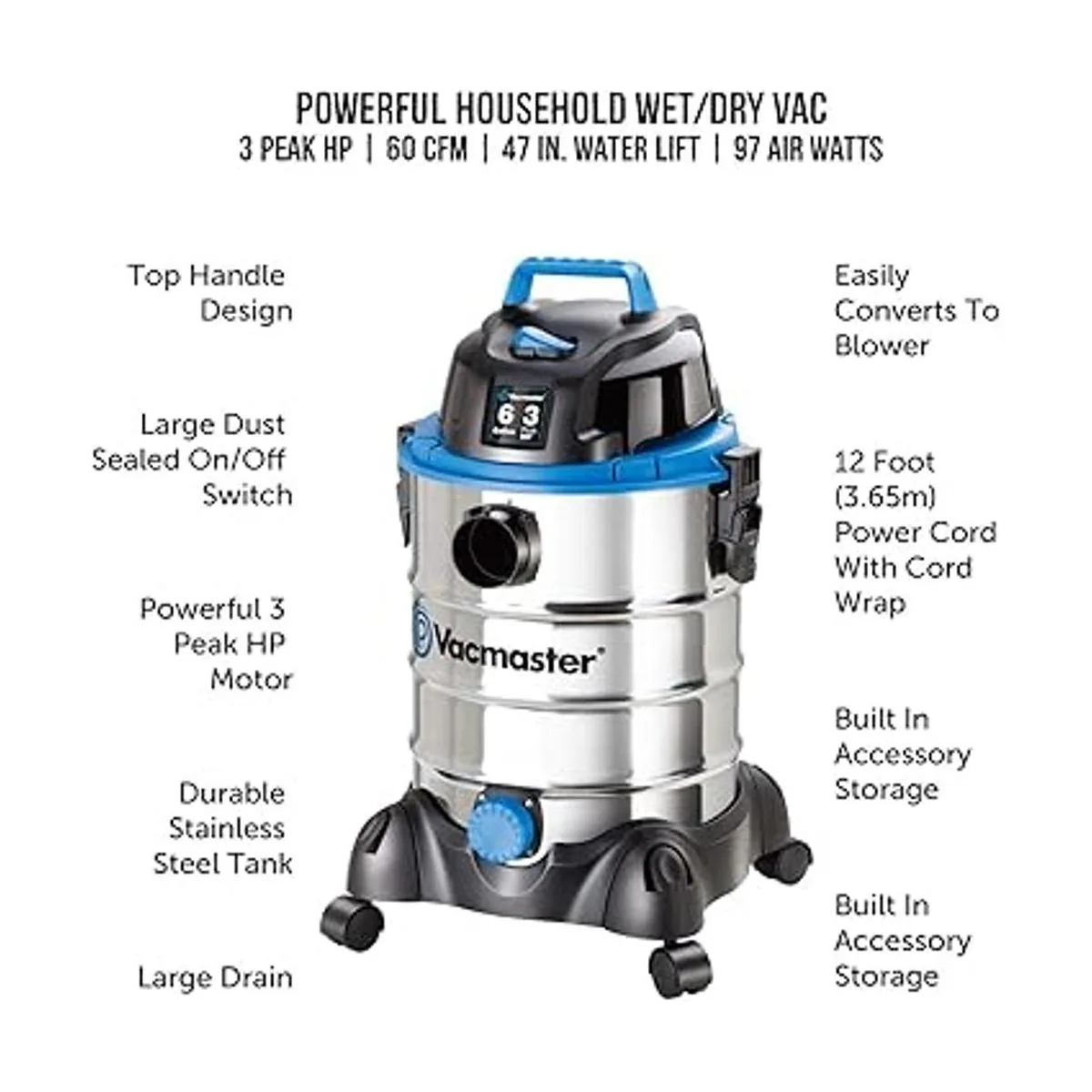 Aspiradora Vacmaster para polvoagua de acero inoxidable, 6 galones, pico 3HP VQ607SFD