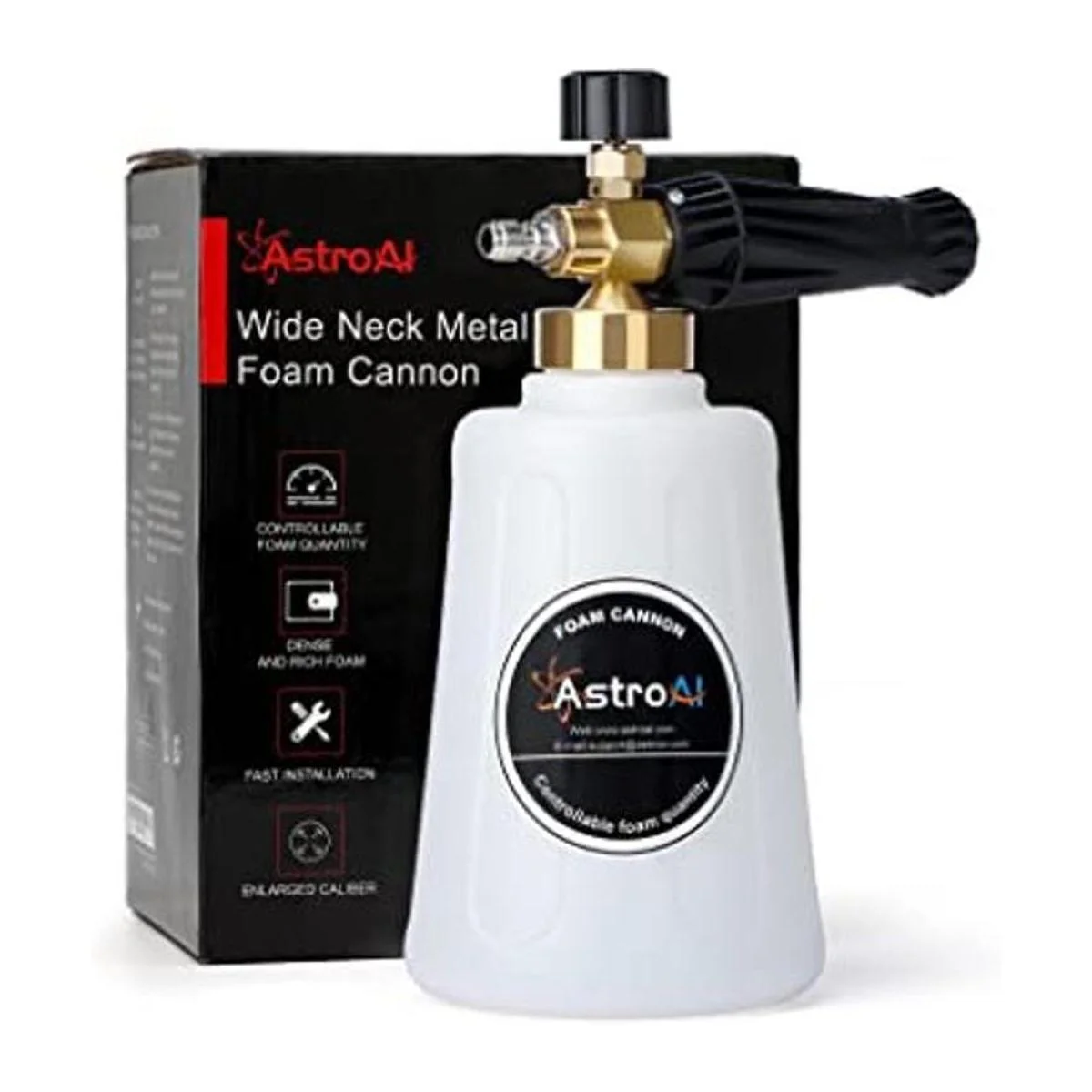 AstroAI Cañón de espuma resistente para automóvil, botella de cuello ancho de metal, lanza de espuma de nieve ajustable para lavadora a presión con conector rápido de 14 pulgadas y botella de 1.5 L, no se utiliza con manguera de jardín