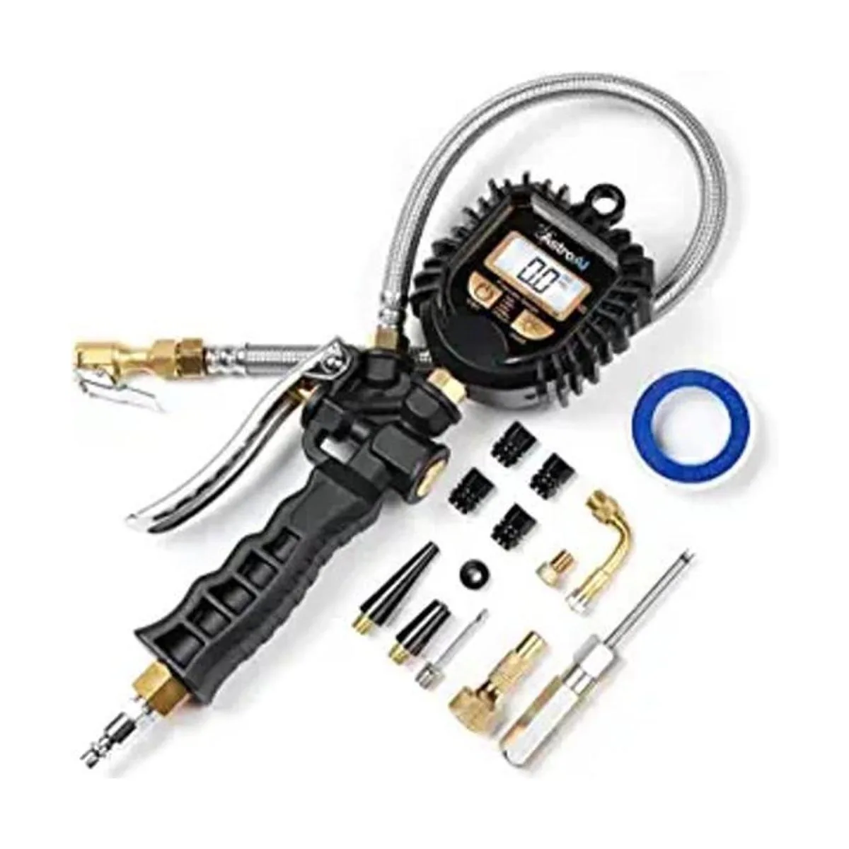 AstroAI Manómetro digital de presión de neumáticos, calibre de inflador de neumáticos de alta resistencia de 250 PSI, accesorios para compresor con manguera trenzada de acero inoxidable, esfera giratoria y acoplador de conexión rápida para camión, caravana, SUV