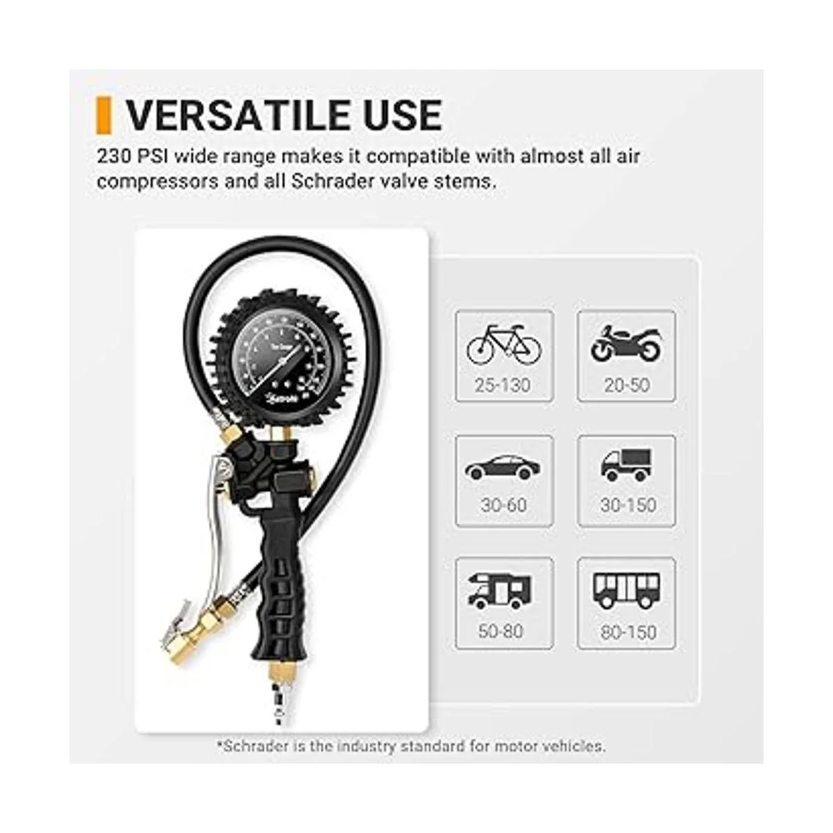 AstroAI Medidor de presión de neumáticos, calibre inflador de neumáticos de 230 PSI, resistente con dial giratorio de 360 y portabrocas de aire, adaptador de válvula Presta de bicicleta, 4 tapas de válvula, compatible con bicicletacamiónSUVmotocicletaRV
