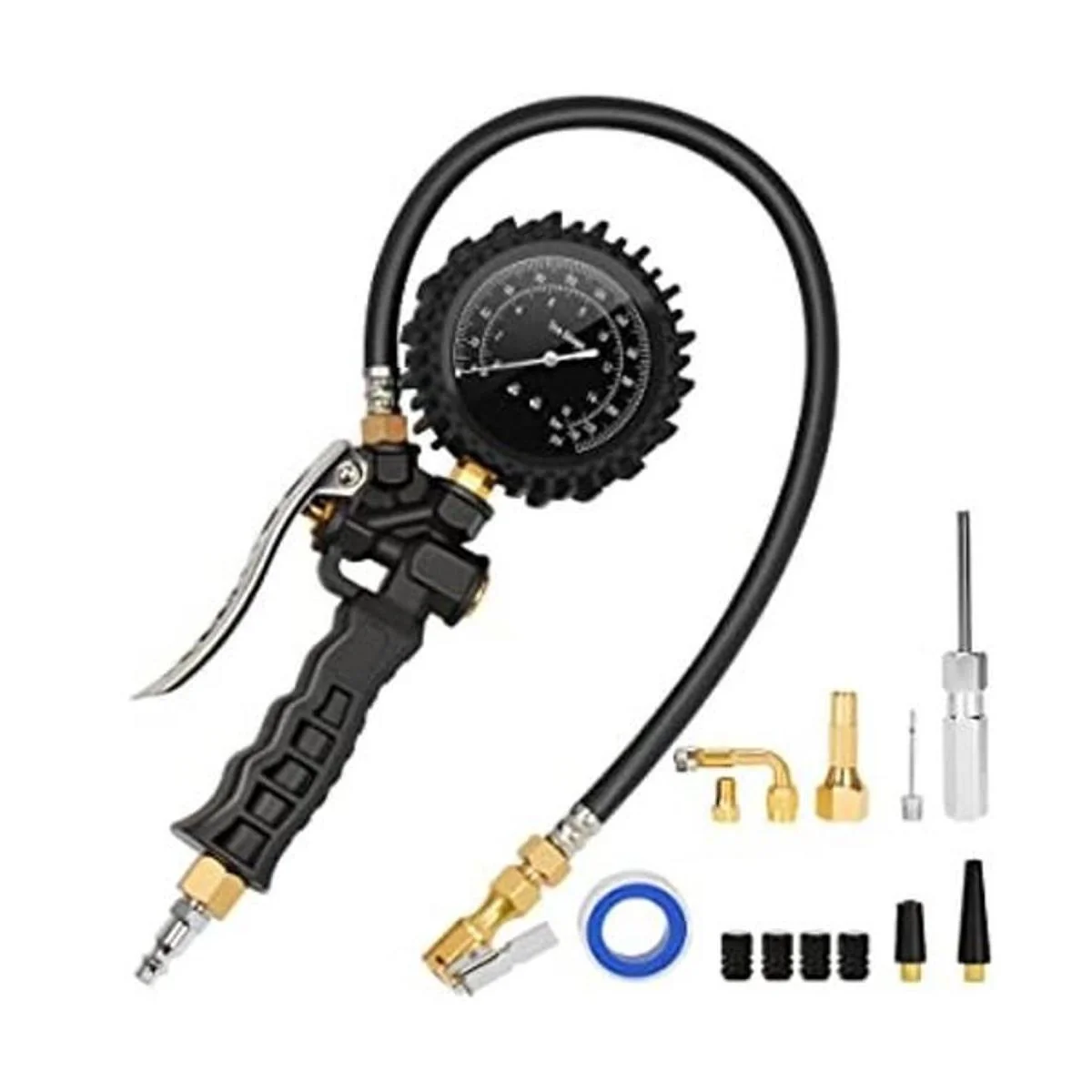 Resistente: el portabrocas de aire de latón sólido y resistente hace que sea más fácil bloquear en las válvulas del vástago deteniendo fugas; gatillo de inflado de acero inoxidable de calidad para un rendimiento duradero; la manguera de goma de 18.5 pulgadas es mucho más fuerte y flexible, lo suficientemente resistente como para soportar alta presión