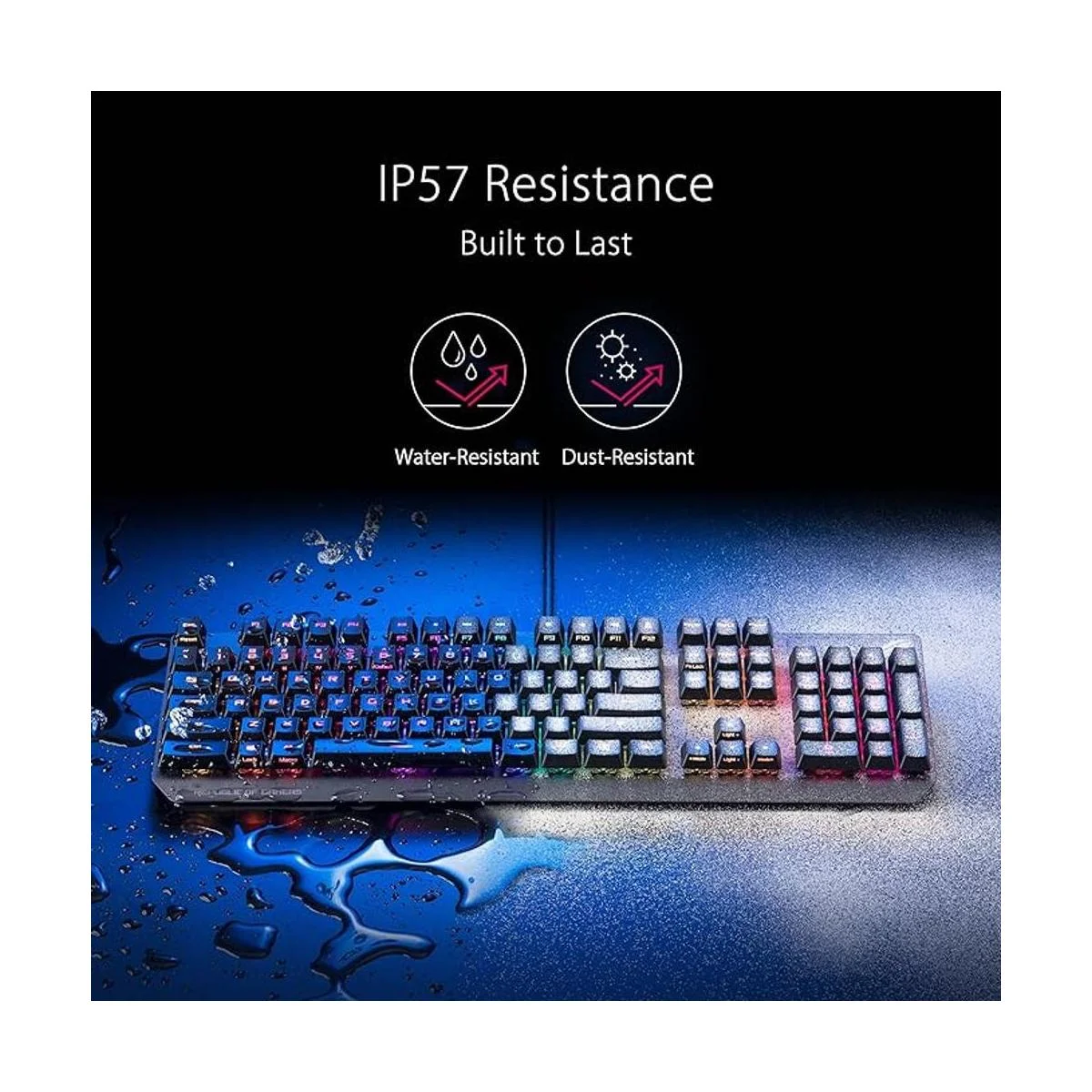 Construido para durar: ROG Strix Scope RX ofrece resistencia al agua IP57 líder en la industria y al polvo, asegurando que está bien protegido de derrames y polvo. También tiene una placa superior de aleación de aluminio duradera que proporciona rigidez estructural para darte un rendimiento duradero y fiable.