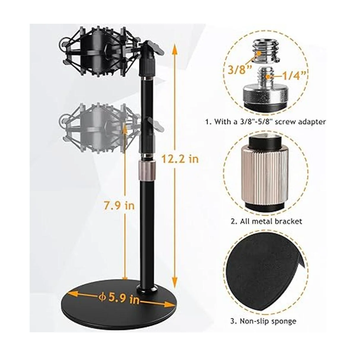 Base pesada y altura ajustable: este soporte de micrófono de mesa con un diámetro de 5.9 pulgadas, base de metal pesado de 1.1 libras. Proporciona más estabilidad y equilibrio preciso para evitar que el micrófono se caiga. Su altura es de 7.9 pulgadas y se puede ajustar hasta 12.2 pulgadas para permitir un posicionamiento óptimo del micrófono.