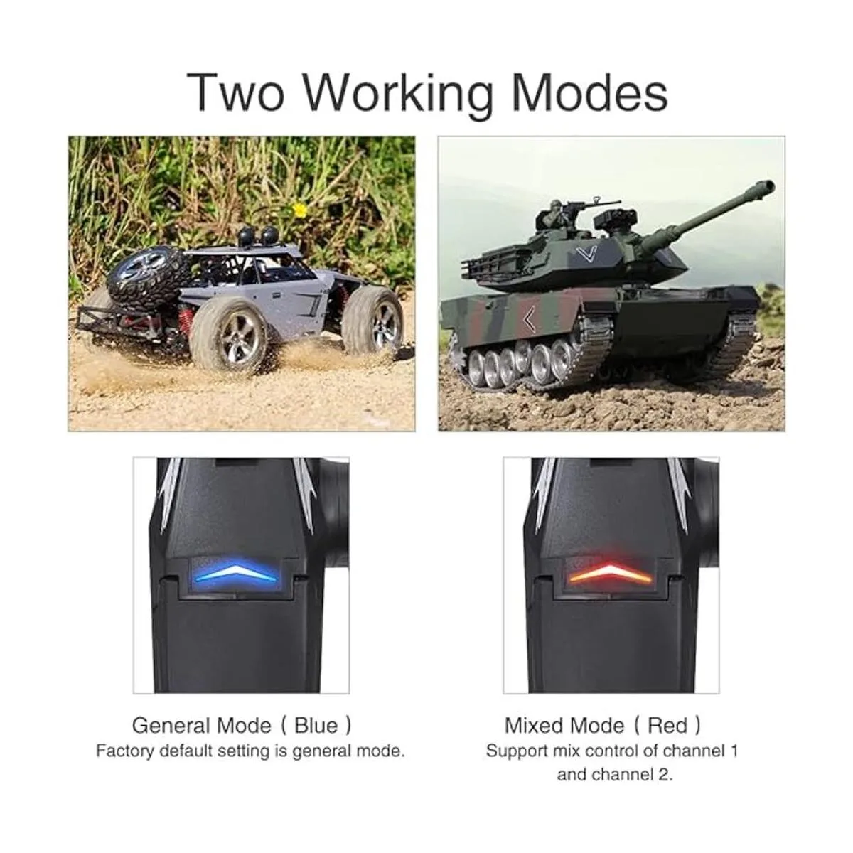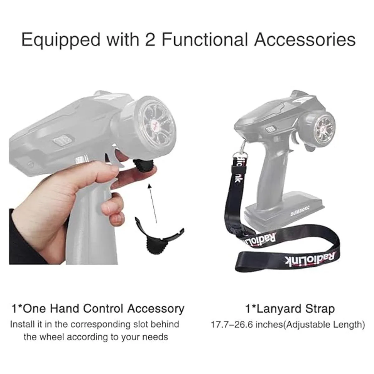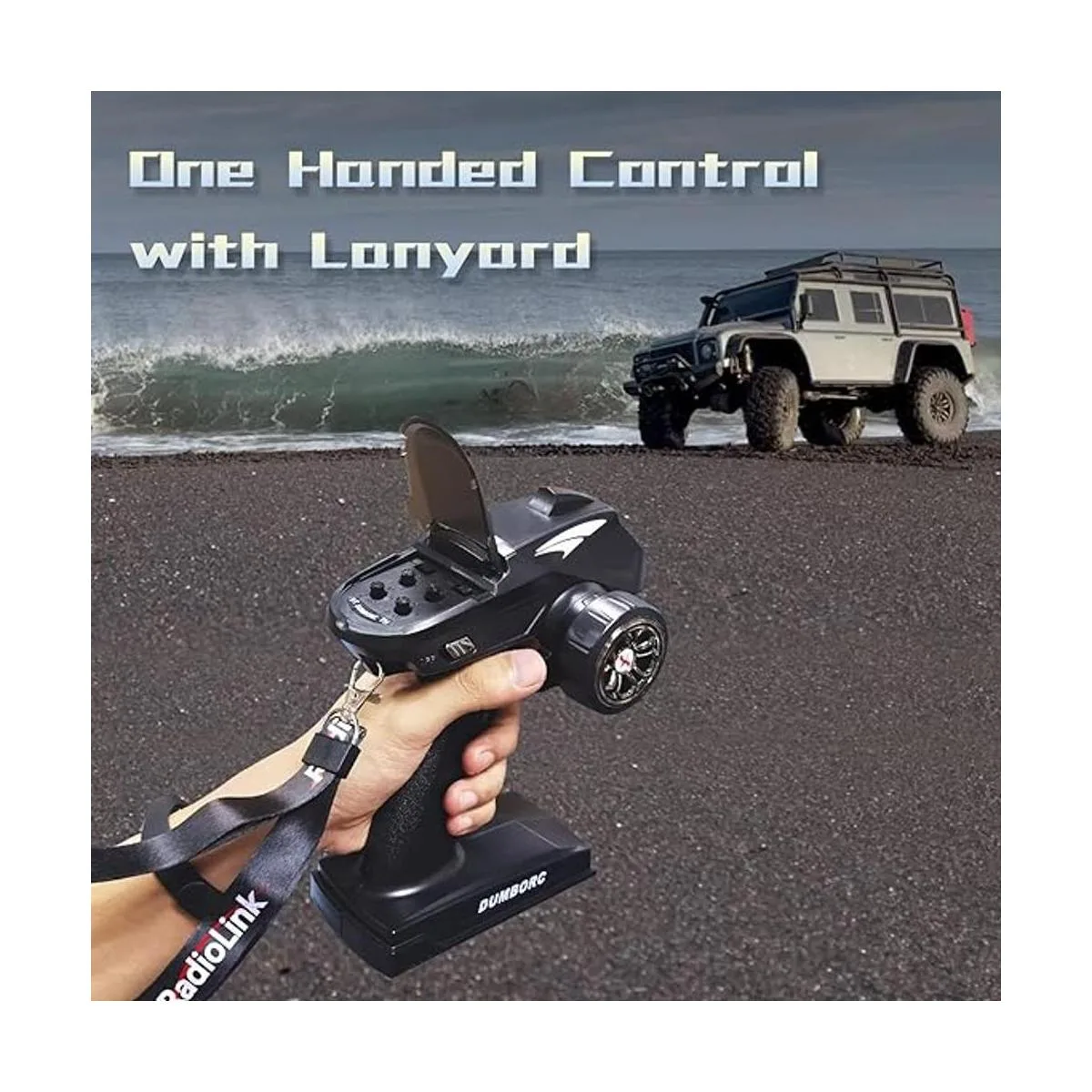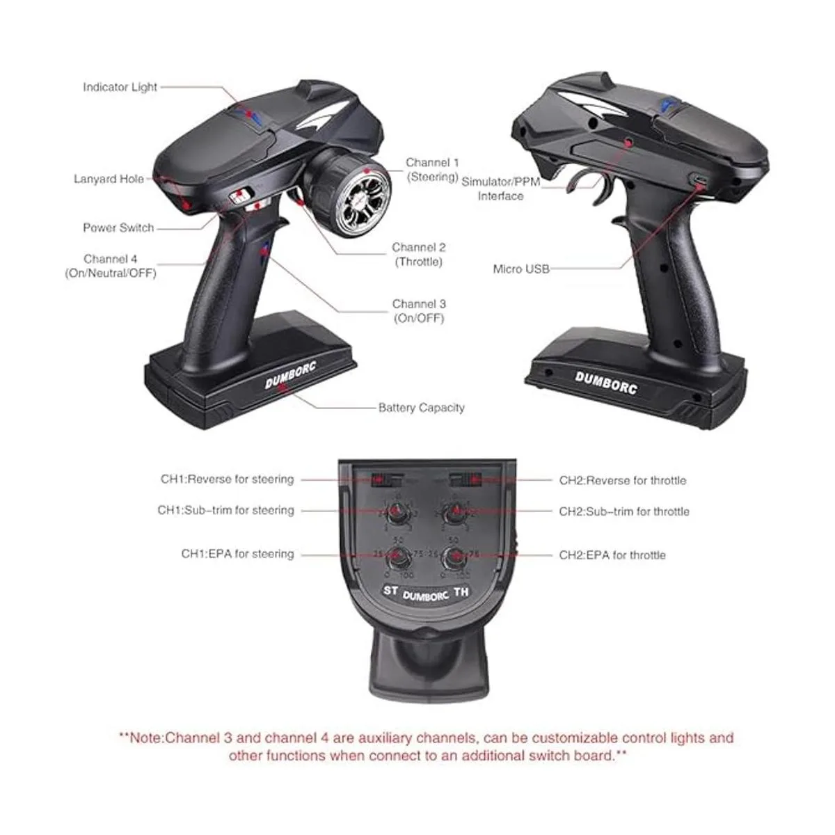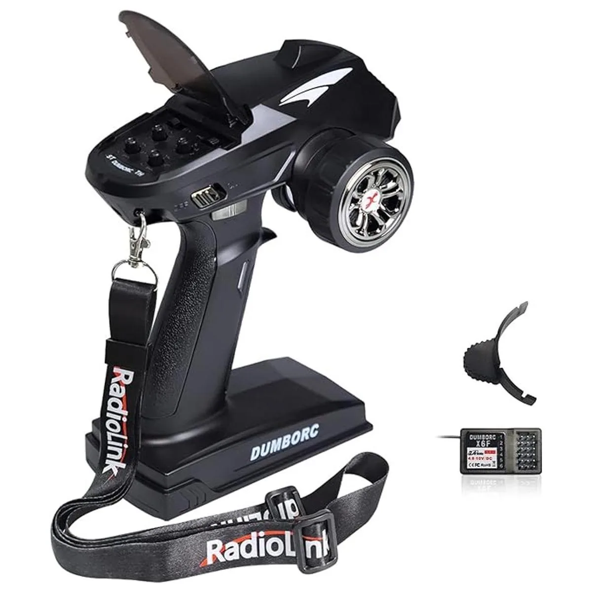 DUMBORC X4 remote controller and X6F receiver with 3ms fast response time and sensitive steering, 2.4GHz strong antiinterference ability which provides long range control distance up to 400 meters, suit for rc cars, boats, tanks, trucks, crawlers, buggies and so on.
