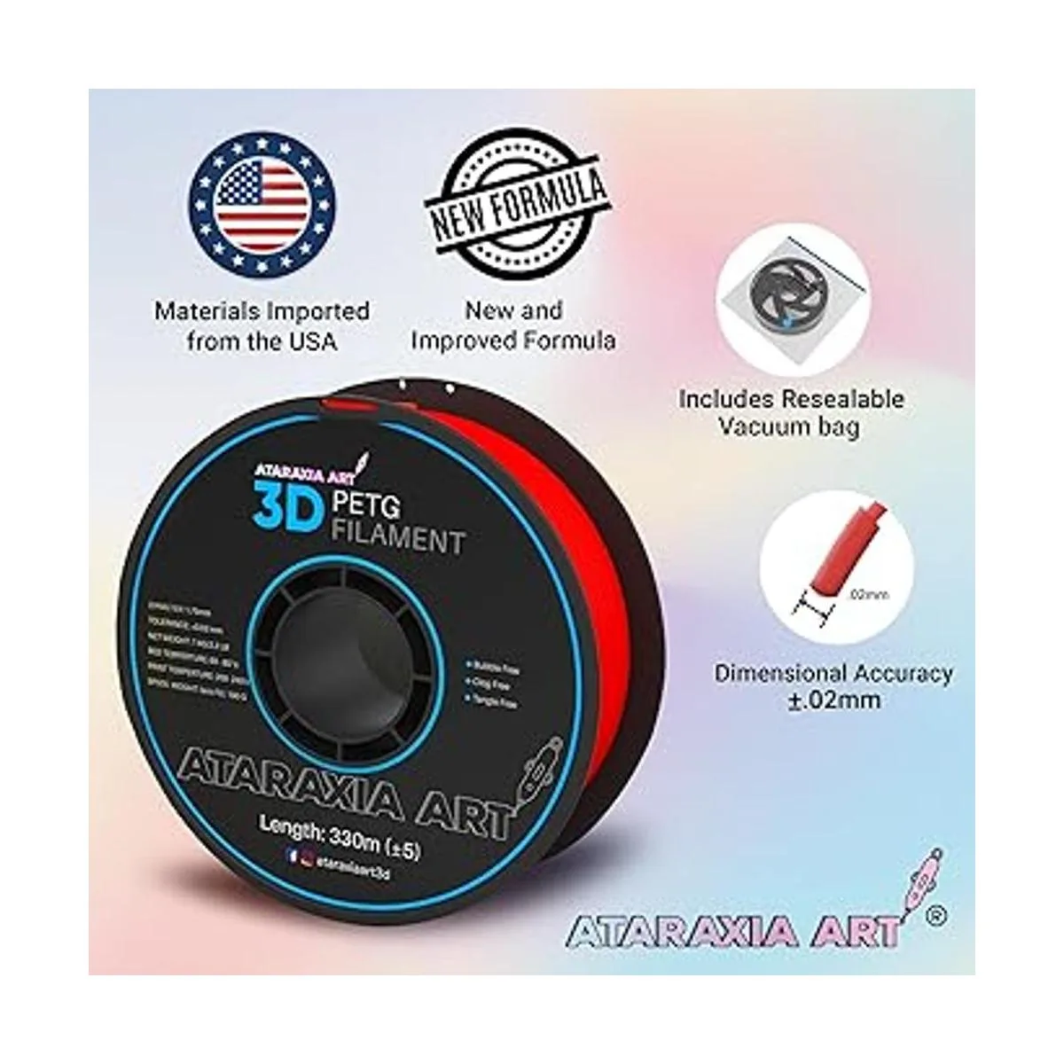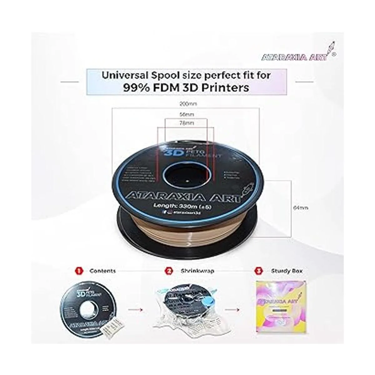 Filamento de impresora 3D Petg de 0.069 in de consistencia dimensional Ataraxia Art utiliza un diámetro CCD avanzado que se seca durante 24 horas. Antes del embalaje y sellado al vacío con desecantes y un sistema de control autoadaptable para garantizar que cada recambio de filamento PETG resistente tenga una tolerancia estricta de 0.001 in. Los filamentos PETG tienen un diámetro de 0.069 in, precisión dimensional 0.001 in y peso neto: carrete de 2.2 lbs. Funciona perfectamente con todas las impresoras 3D FDM del mercado.