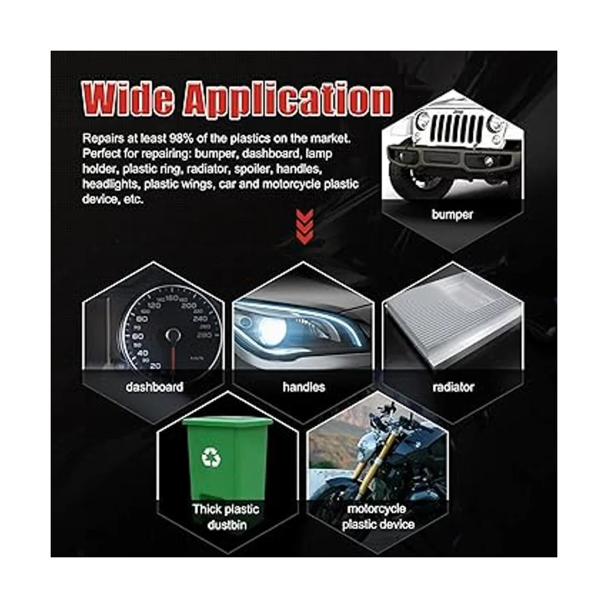 Ajuste multiusos: repara al menos el 98 de los plásticos del mercado. Perfecto para reparar: parachoques, salpicadero, soporte de lámpara, anillo de plástico, radiador, alerón, asas, faros, alas de plástico, dispositivo de plástico para coche y motocicleta, etc