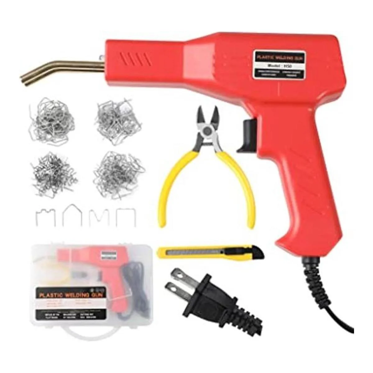 Soldador portátil: kit de soldadura de reparación de plástico, el kit de reparación de kayak de parachoques viene con soldador de plástico, alicates, cuchillo utilitario, funda de transporte, 50 grapas planas de 0.031 in, 50 grapas de esquina exterior de 0.024 in, 50 grapas de esquina interior de 0.031 in, 50 grapas de onda de 0.031 in.